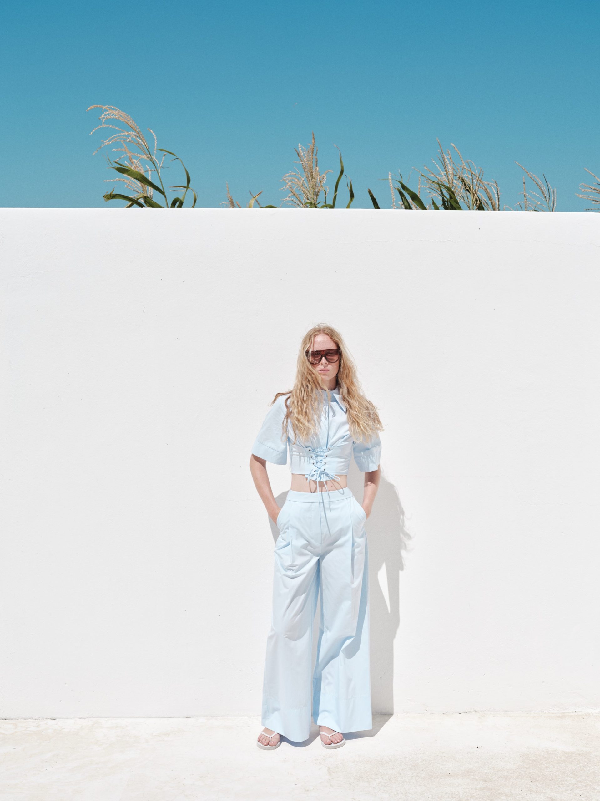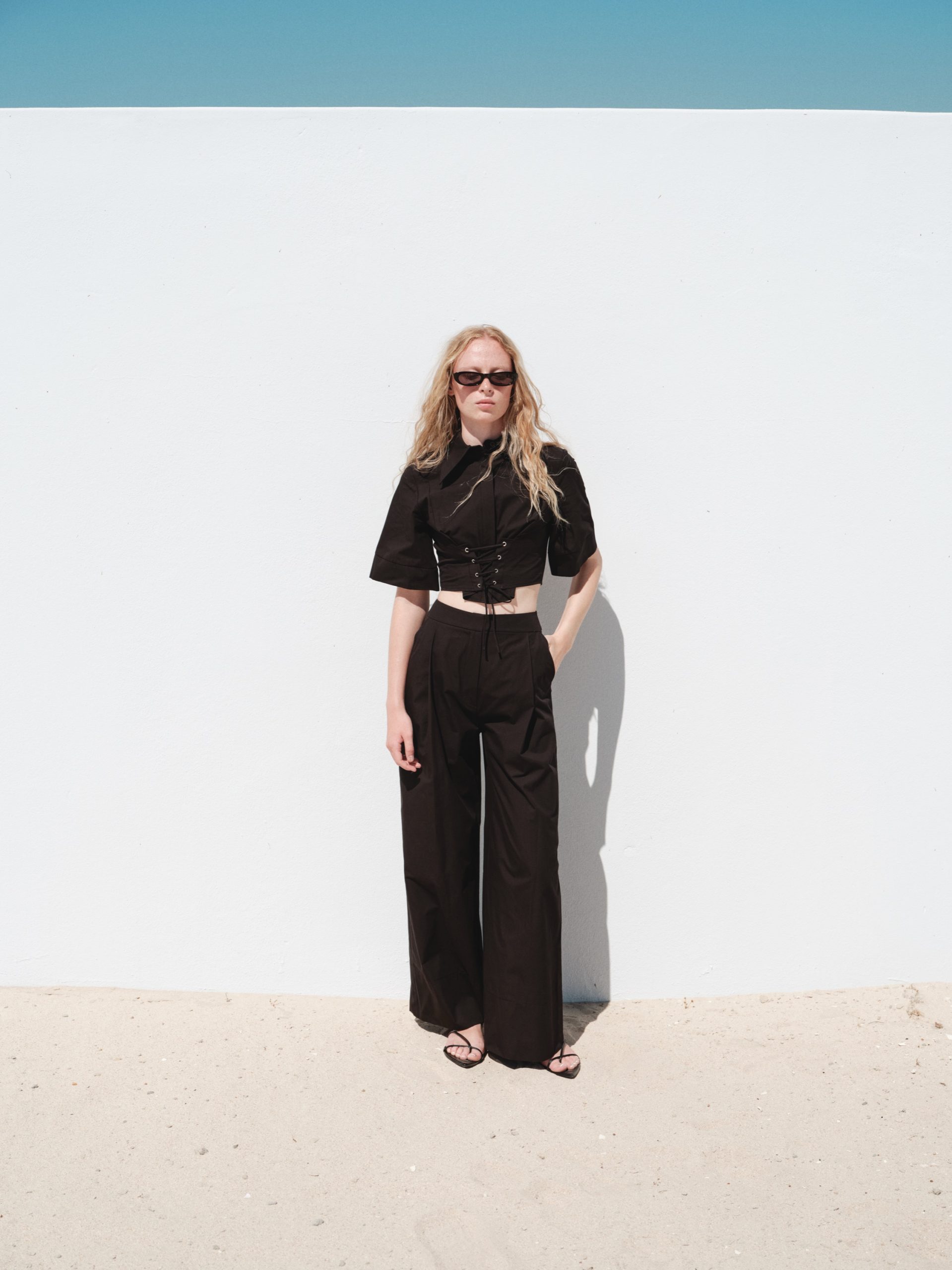 ÜRÜN AÇIKLAMASI: Gömlek yaka, önü düğme iliklemeli, kısa kollu, önü metal kuşgözü bağlamalı crop gömlek.