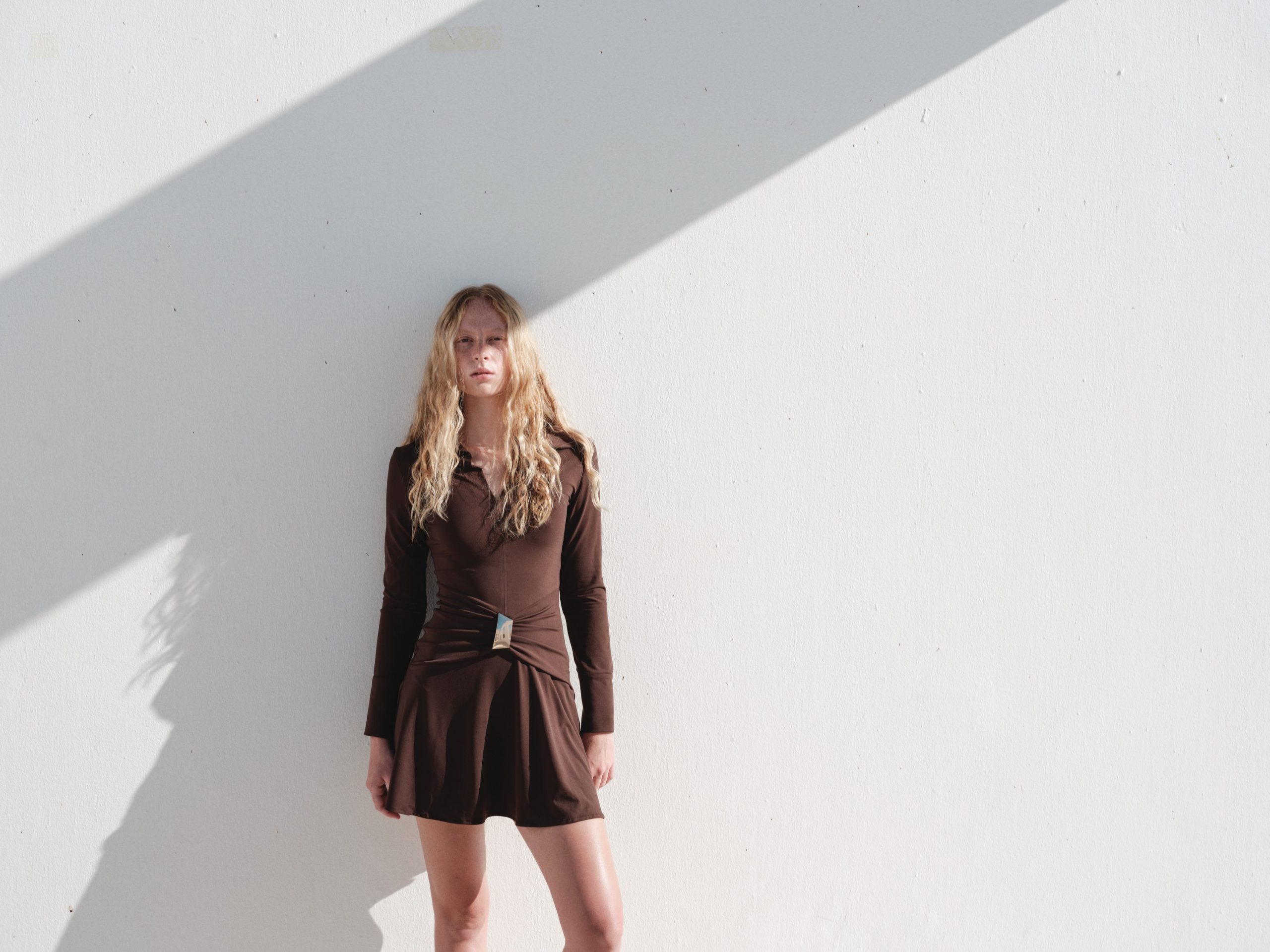 ÜRÜN AÇIKLAMASI:  Gömlek yaka ve yakası v gelen, belinde büzgülü korsajlı, gold toka detaylı, uzun kollu ve manşetli mini boy elbise