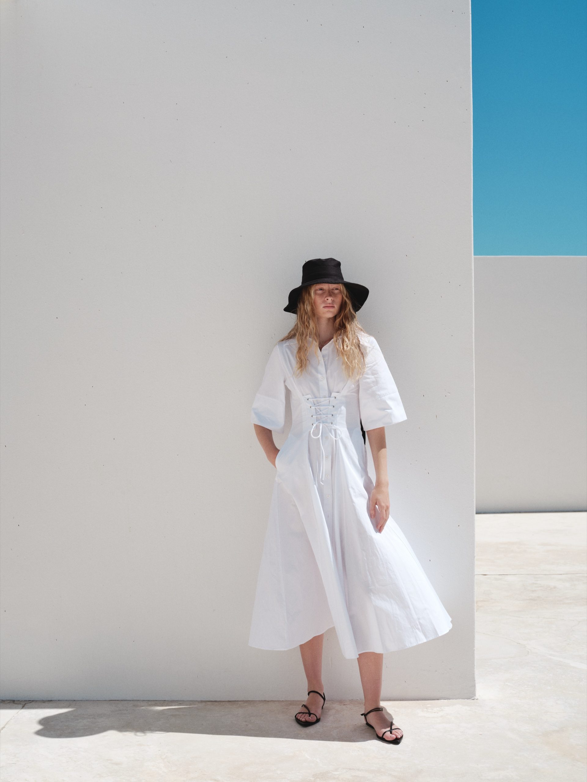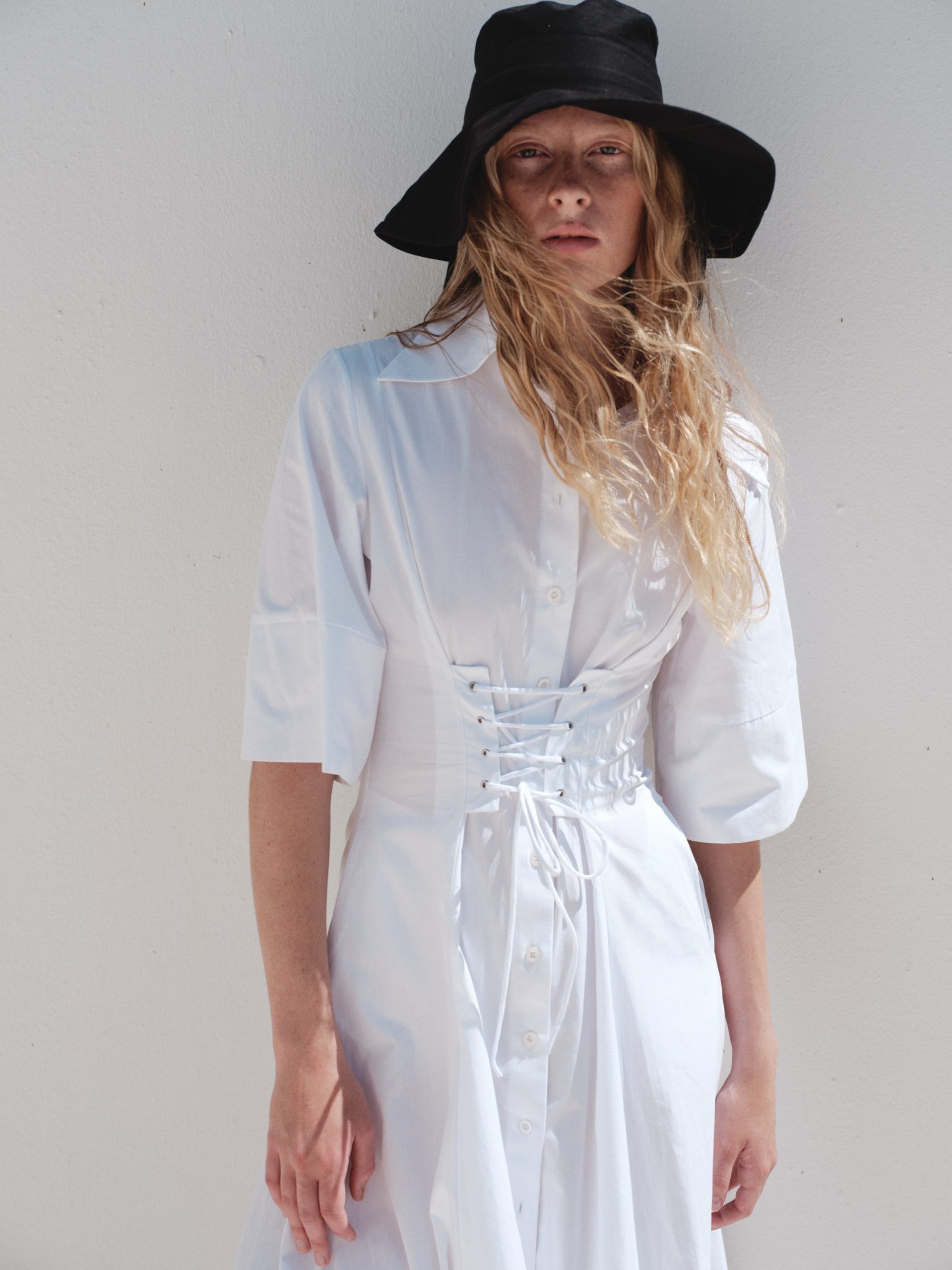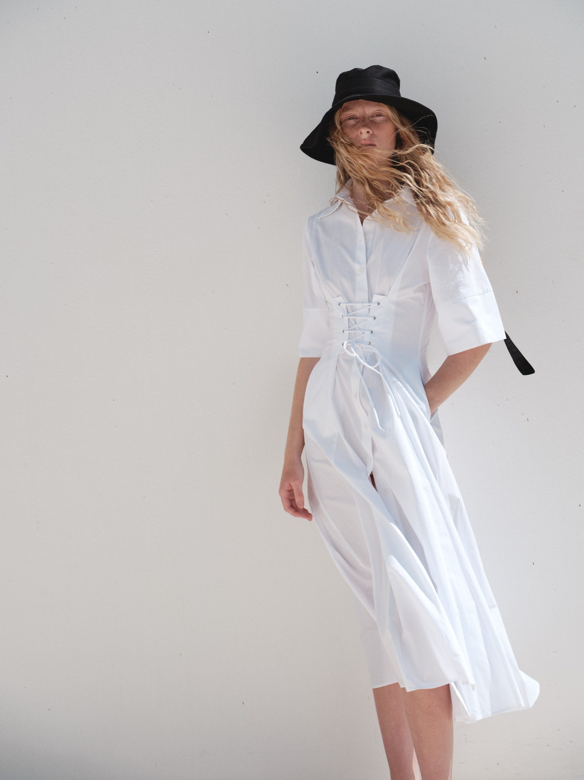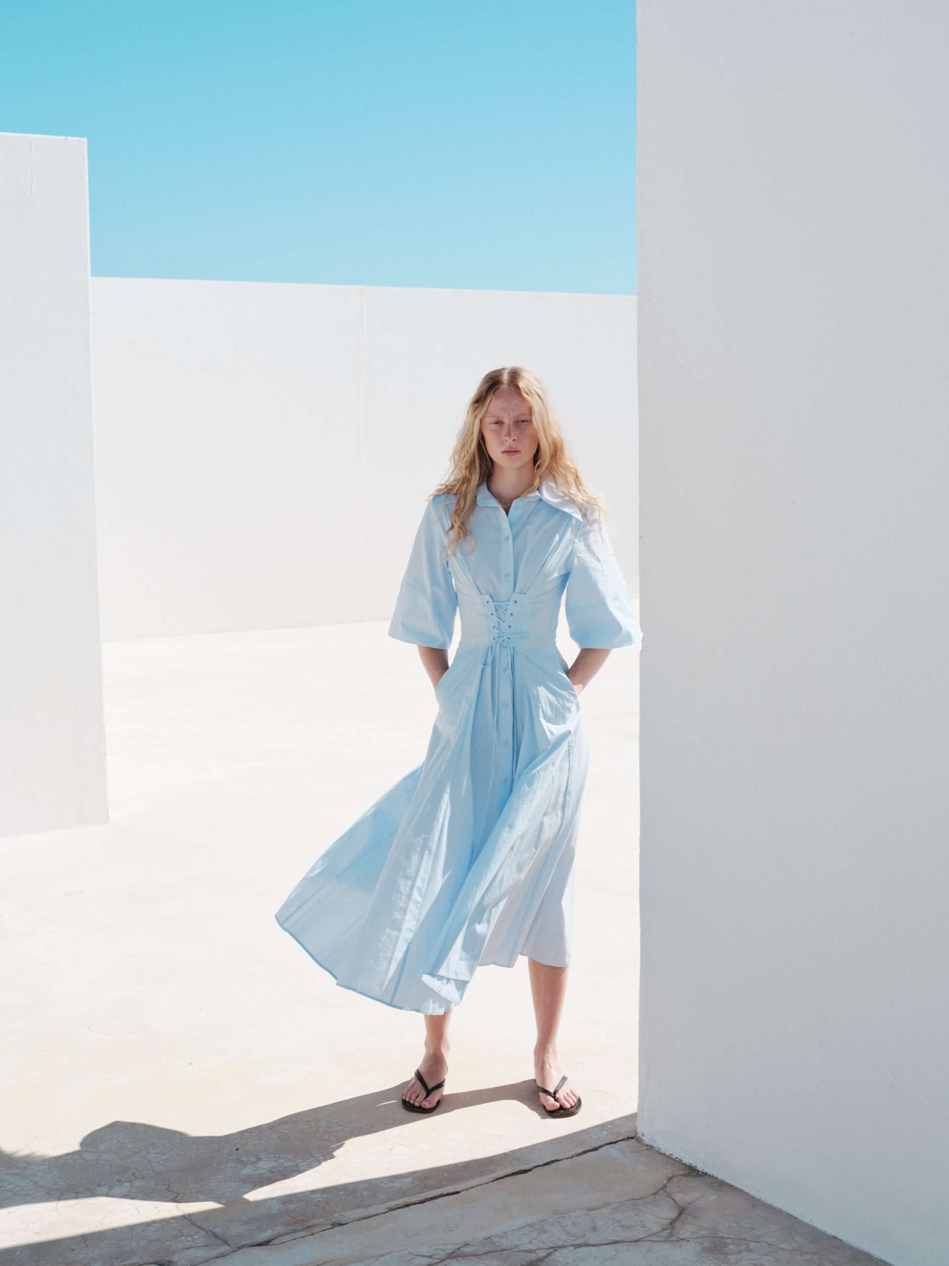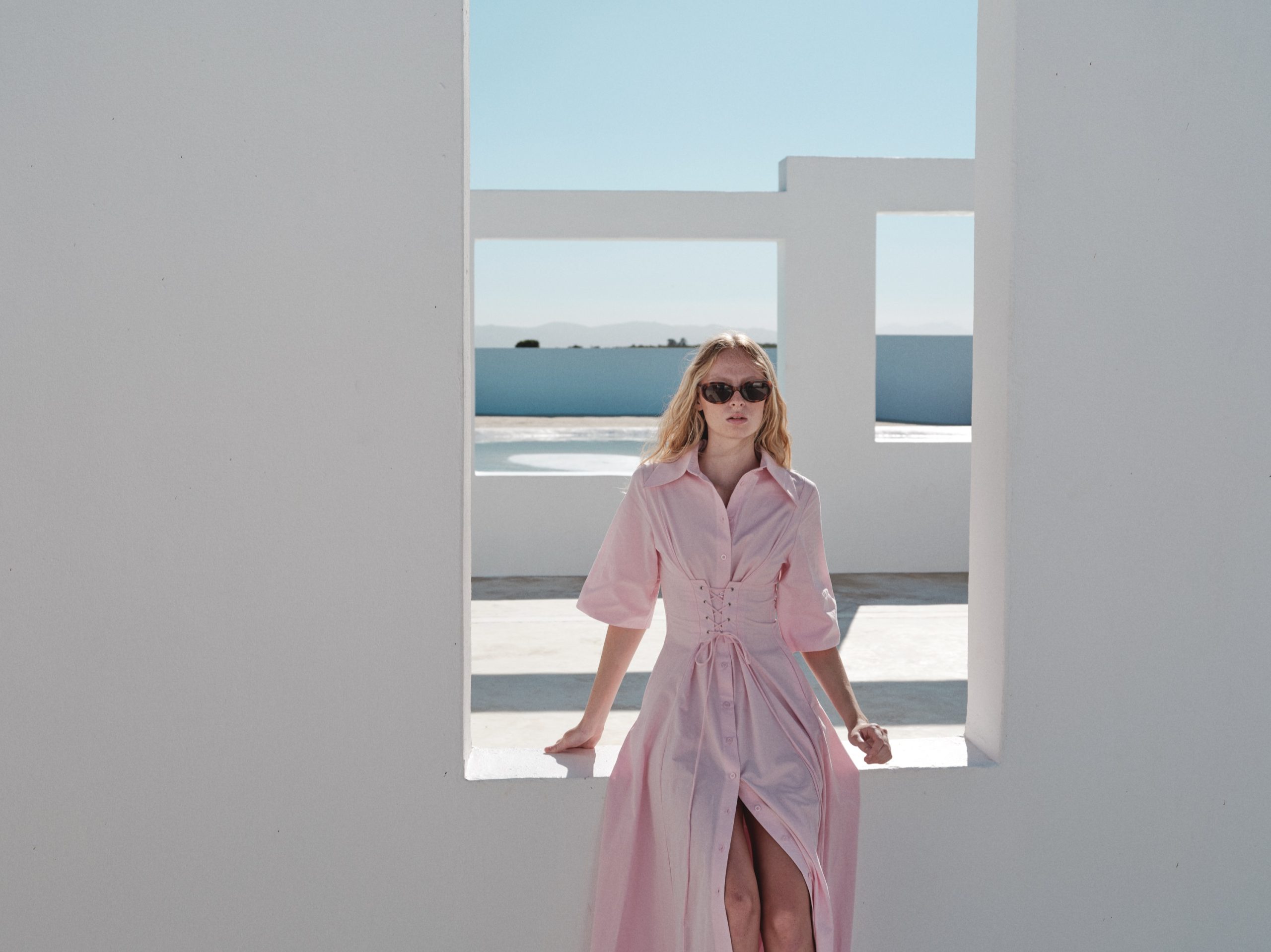 ÜRÜN AÇIKLAMASI: Gömlek yaka, kısa kollu, önü düğme iliklemeli, belinde metal kuşgözü detaylı, midi boy elbise.