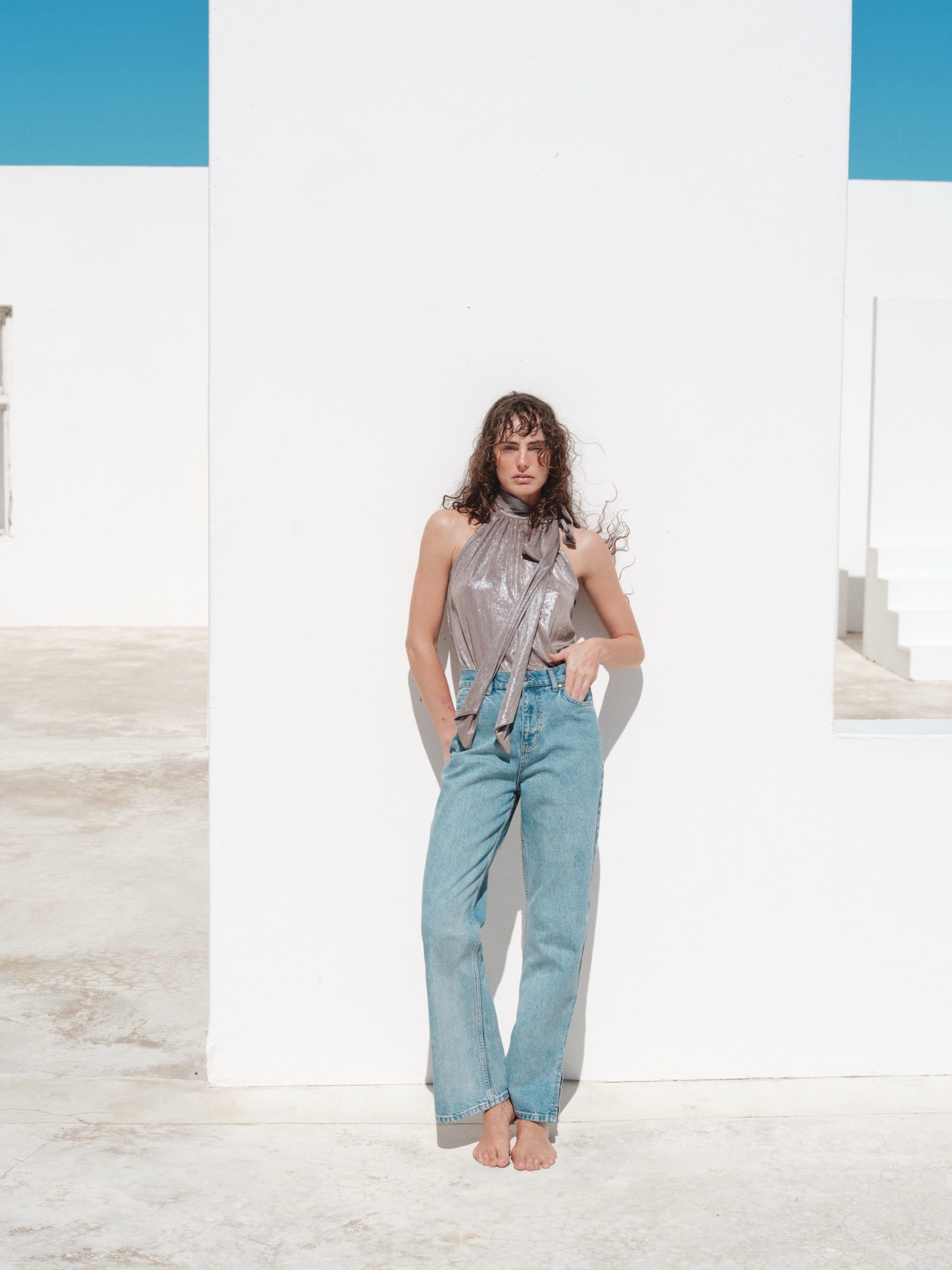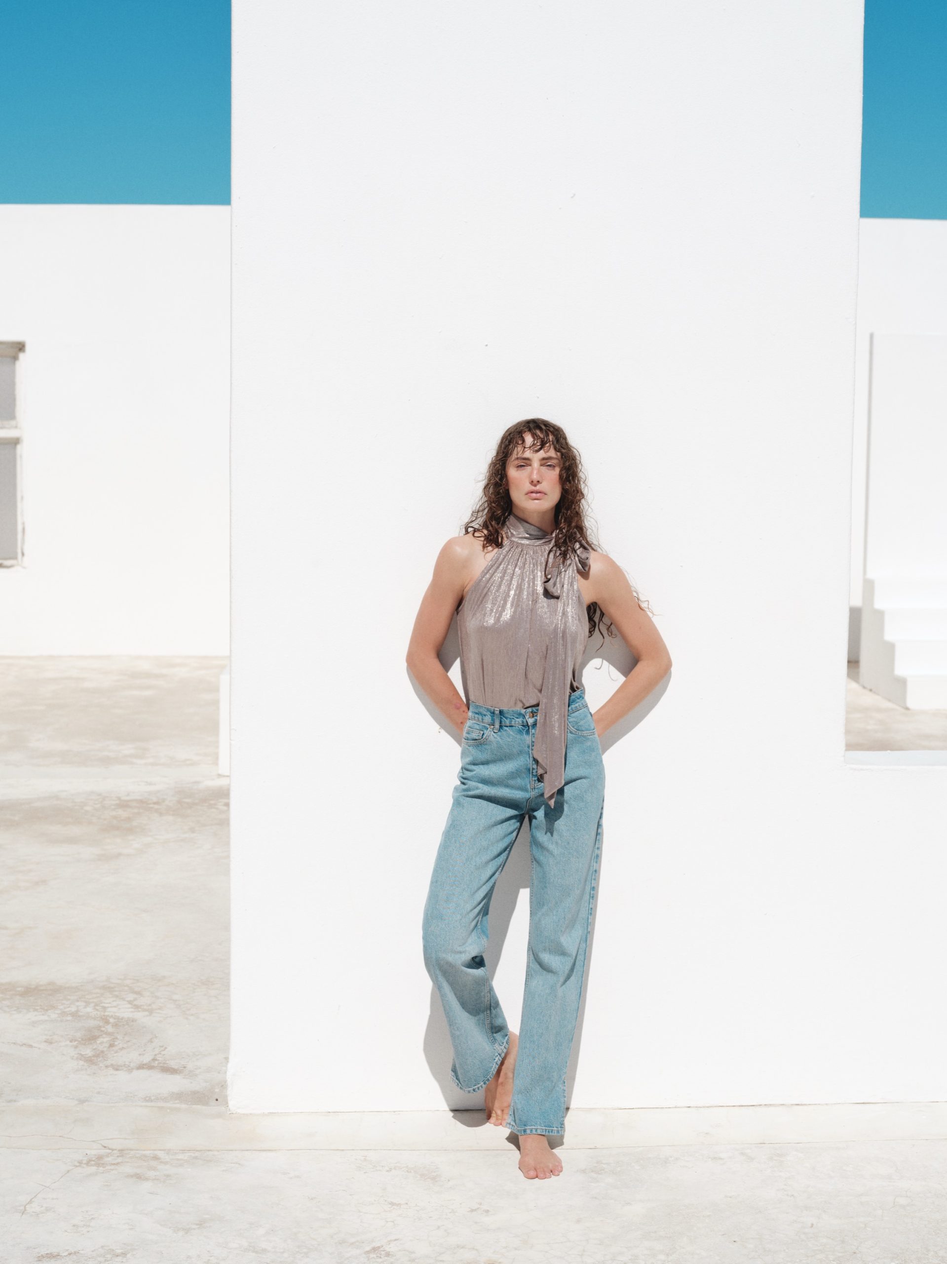 ÜRÜN AÇIKLAMASI: Boyundan bağlamalı,kolsuz, bol kesim parlak kumaştan bluz