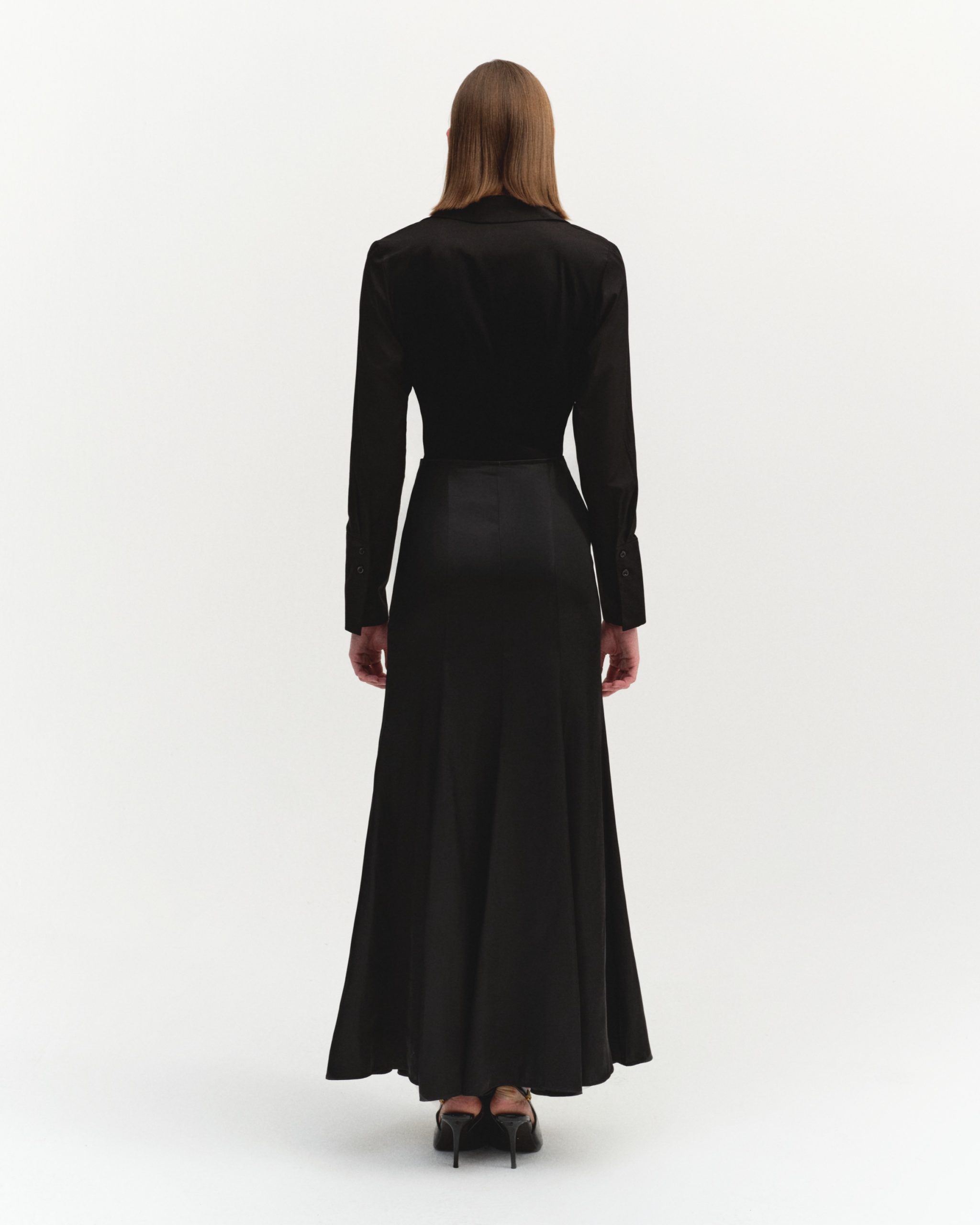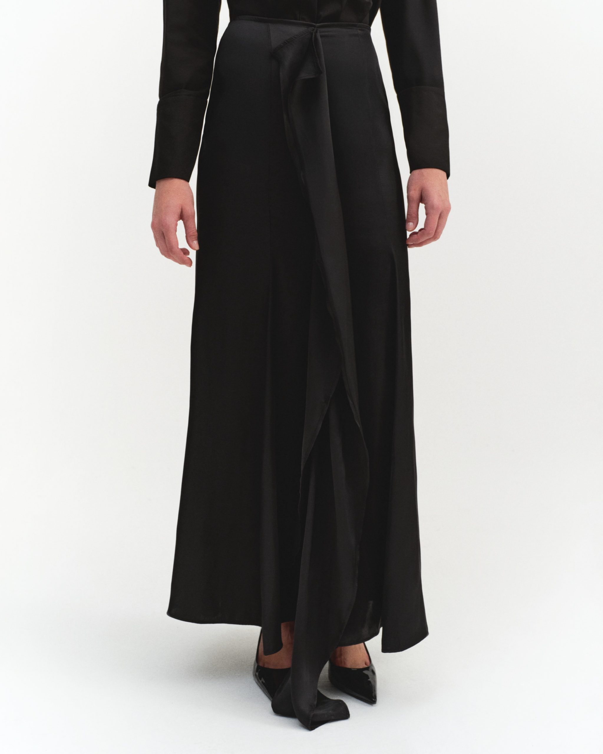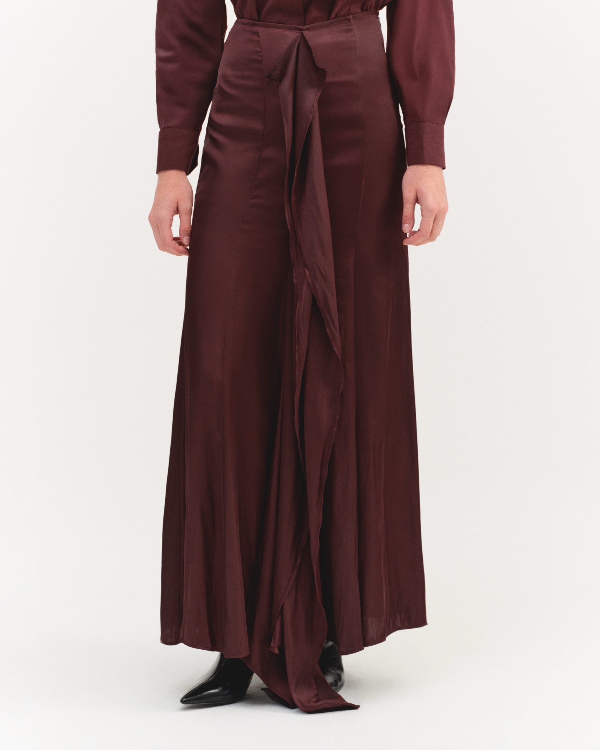 ÜRÜN AÇIKLAMASI: Fermuar kapamalı, önü fırfır detaylı, parçalı ve volanlı maksi boy saten etek.