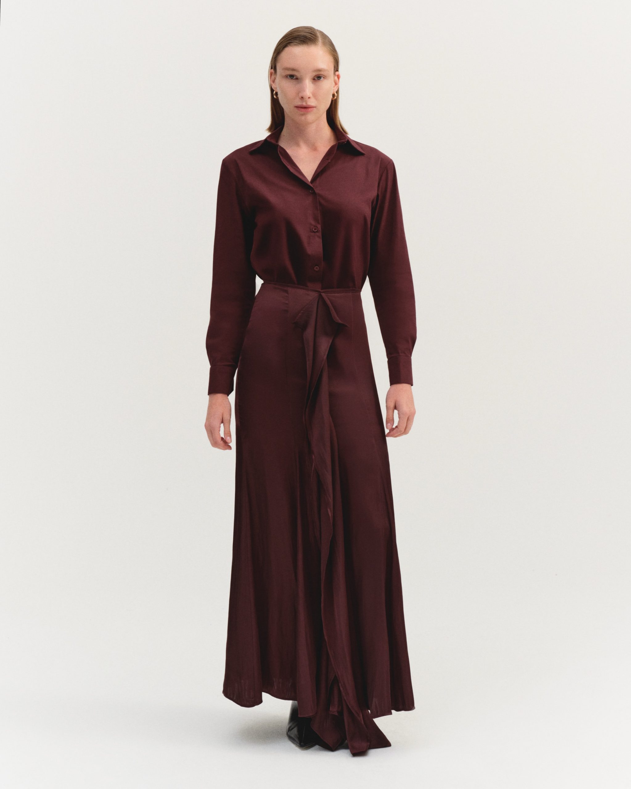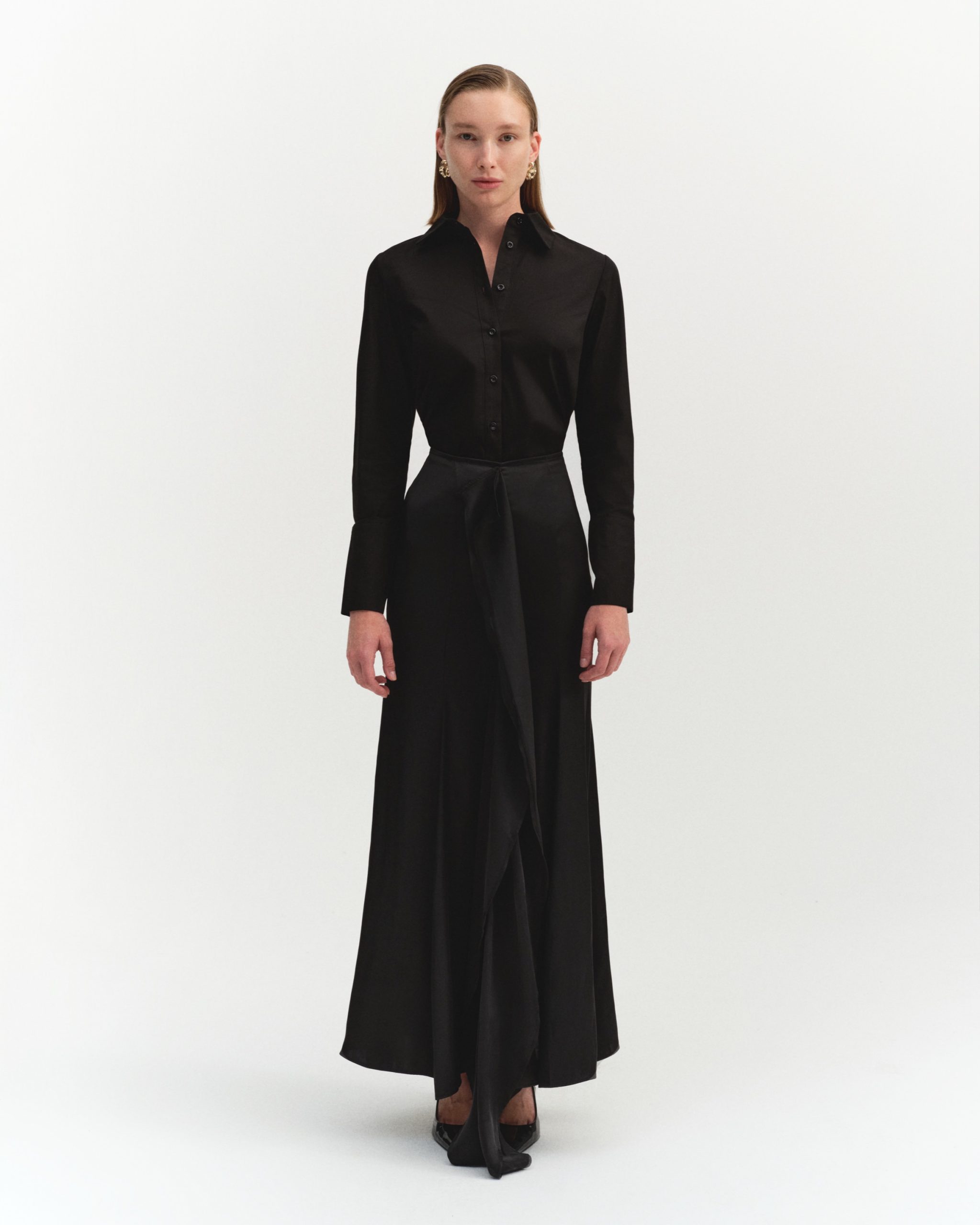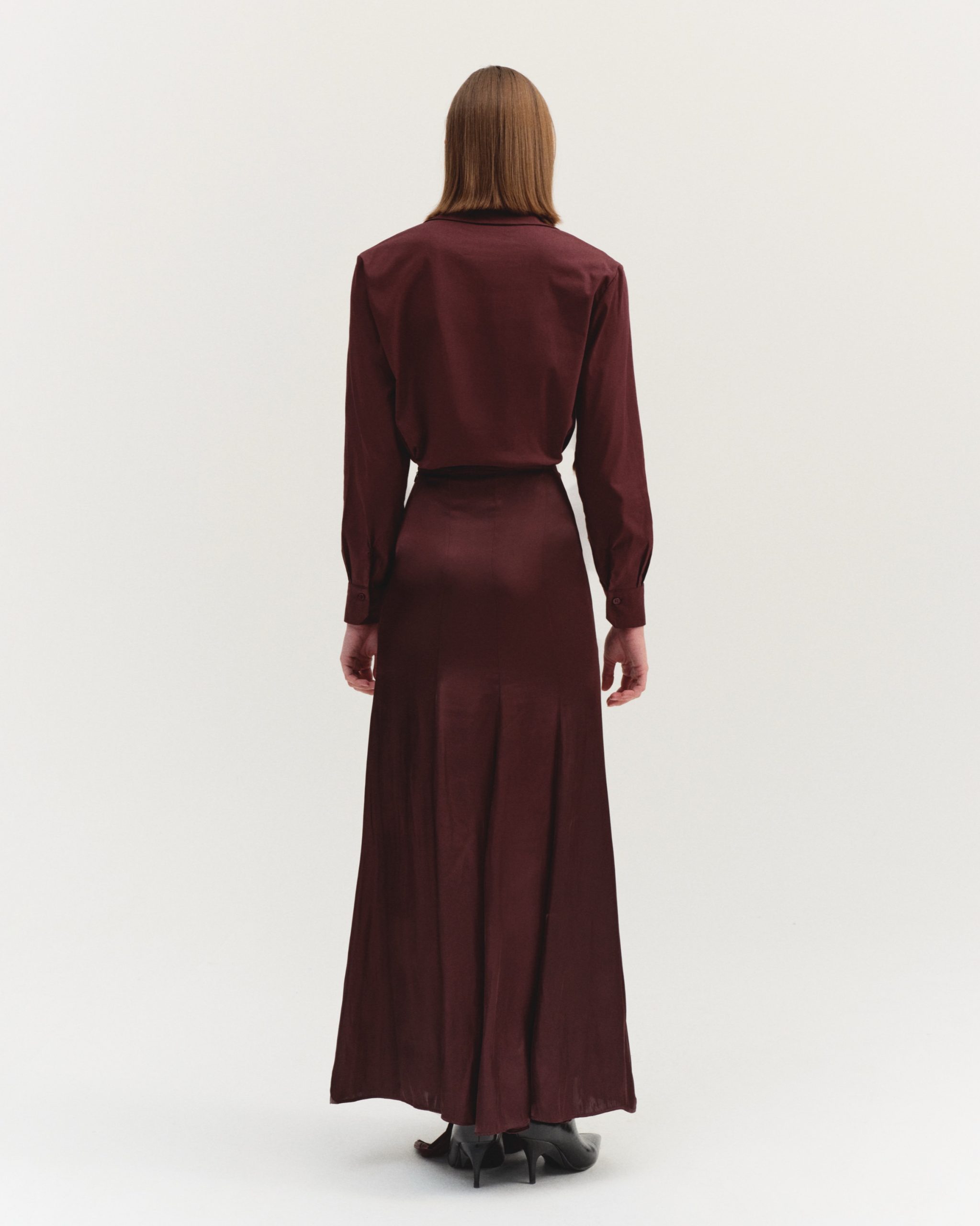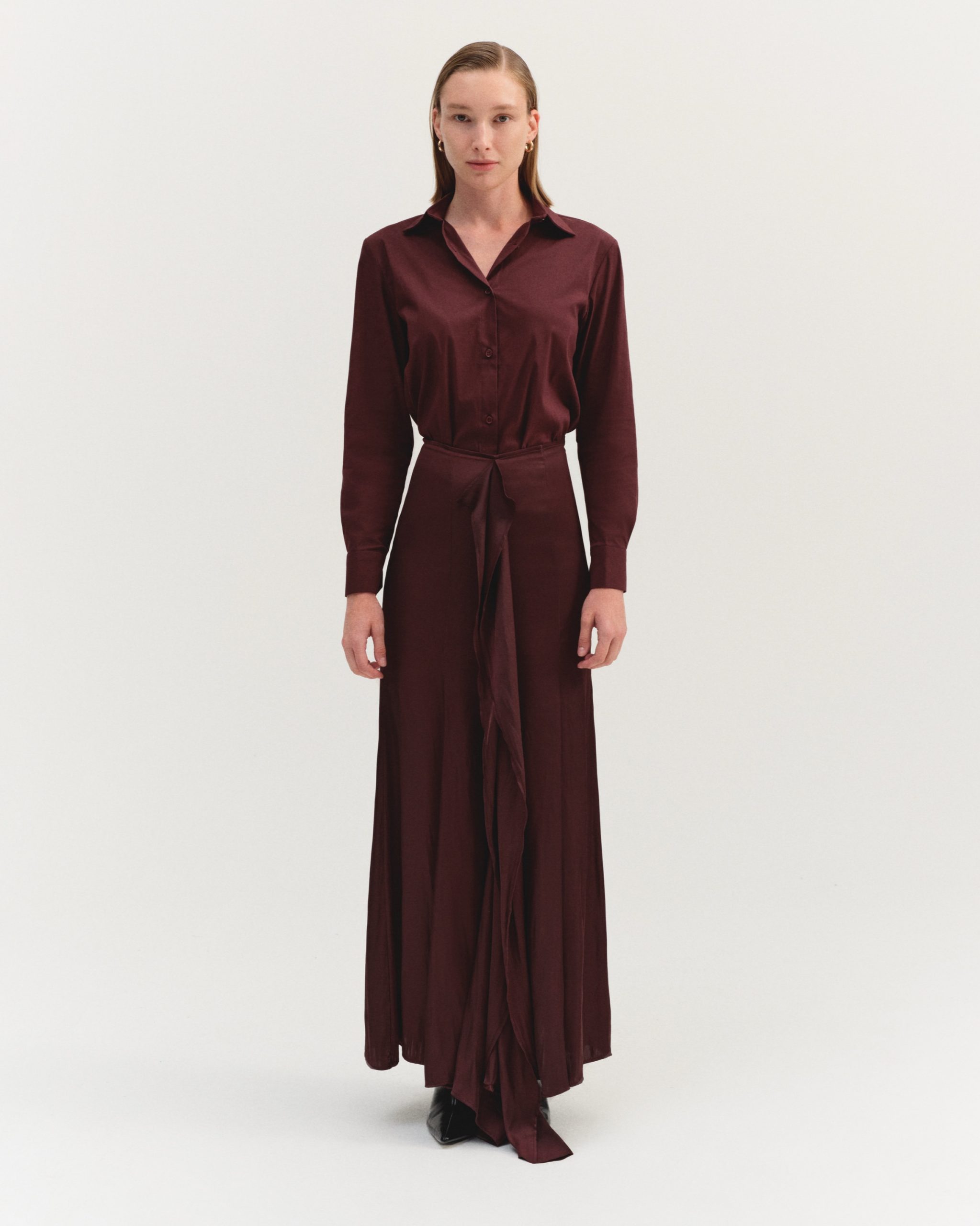 ÜRÜN AÇIKLAMASI: Fermuar kapamalı, önü fırfır detaylı, parçalı ve volanlı maksi boy saten etek.