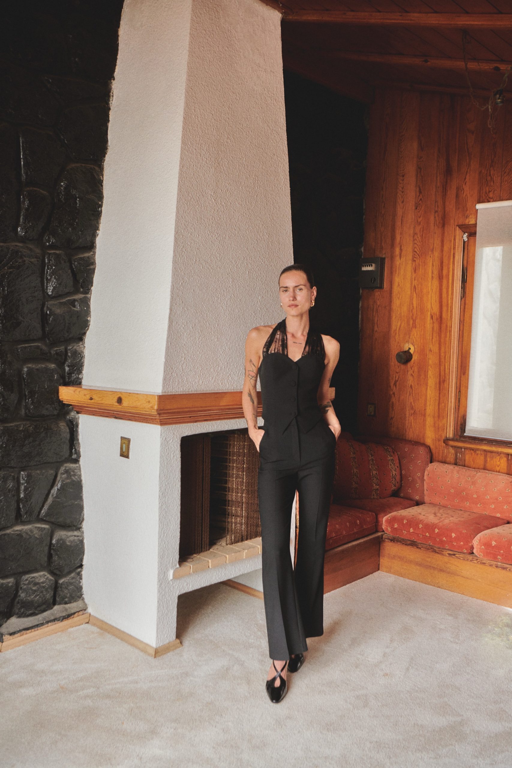 ÜRÜN AÇIKLAMASI: Kendinden kumaş kaplamalı düğmeli,önü düğme iliklemeli,  kuplu, boyunda dantel detaylı yelek. Metal kanca ve fermuar kapamalı, yanları cepli ispanyol paça pantolon.