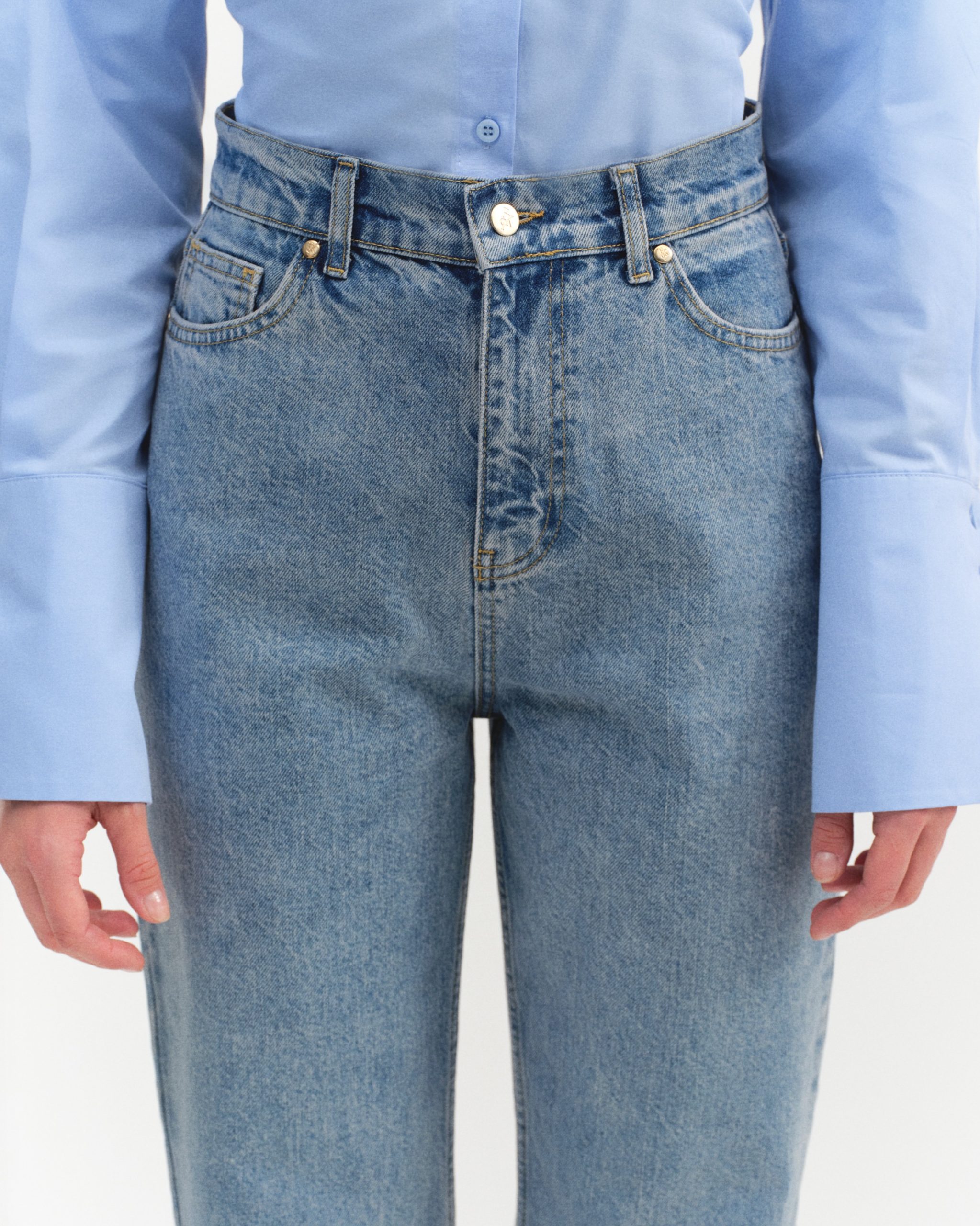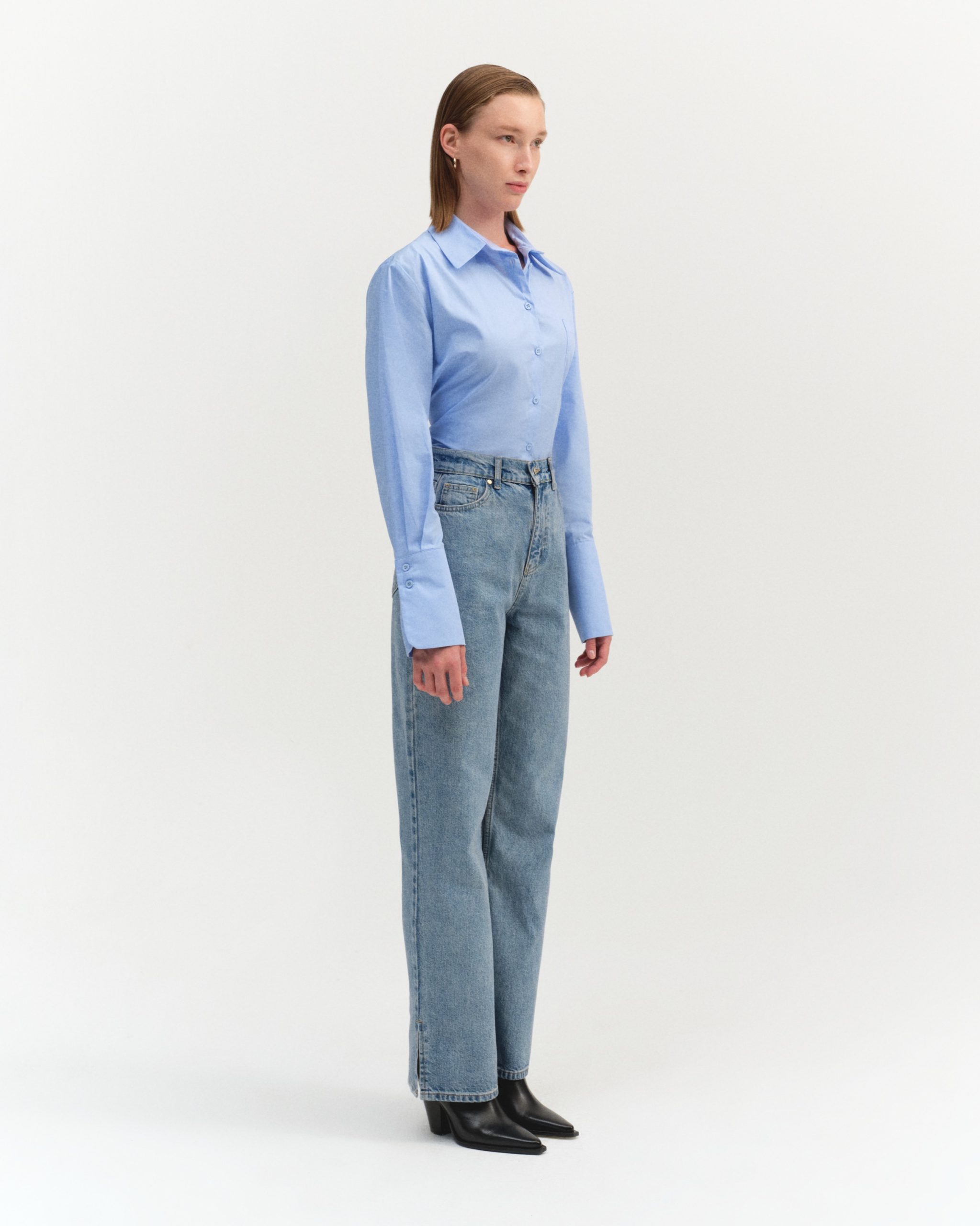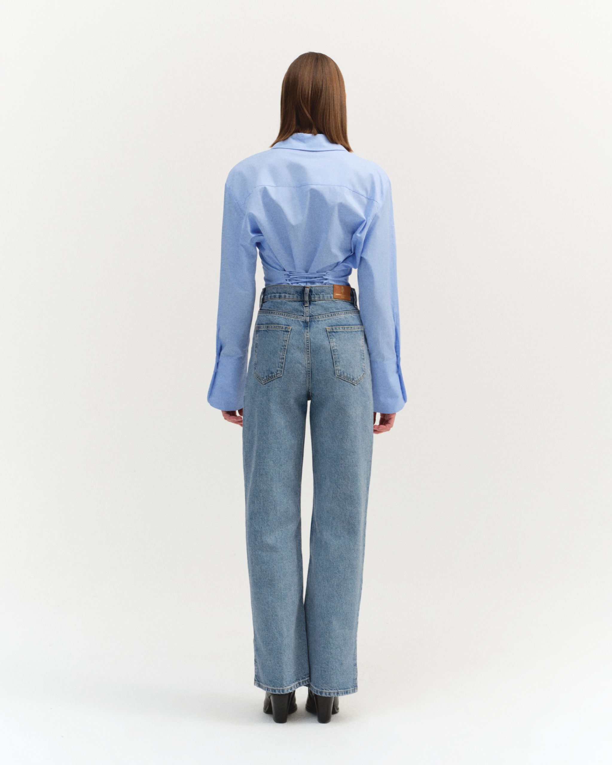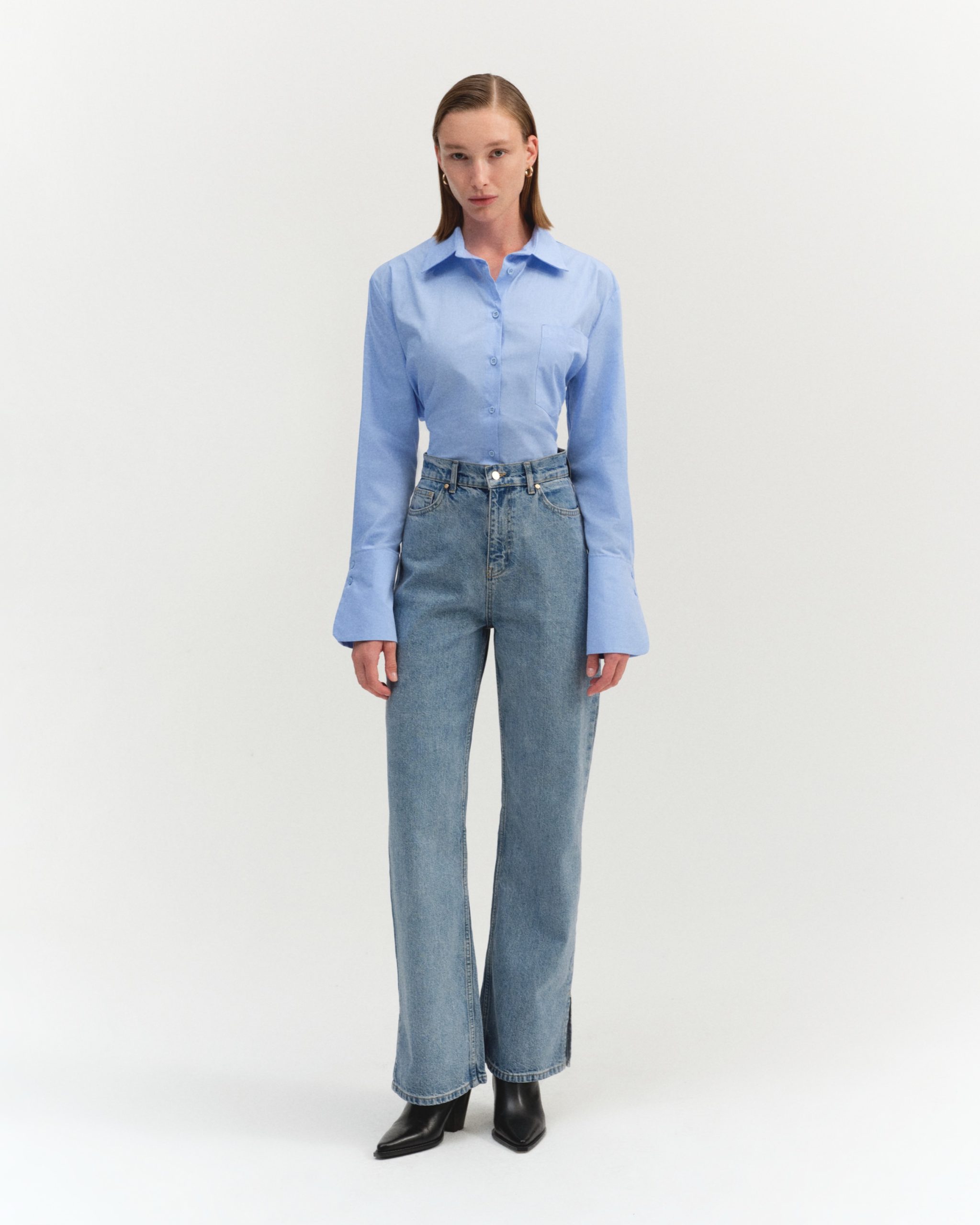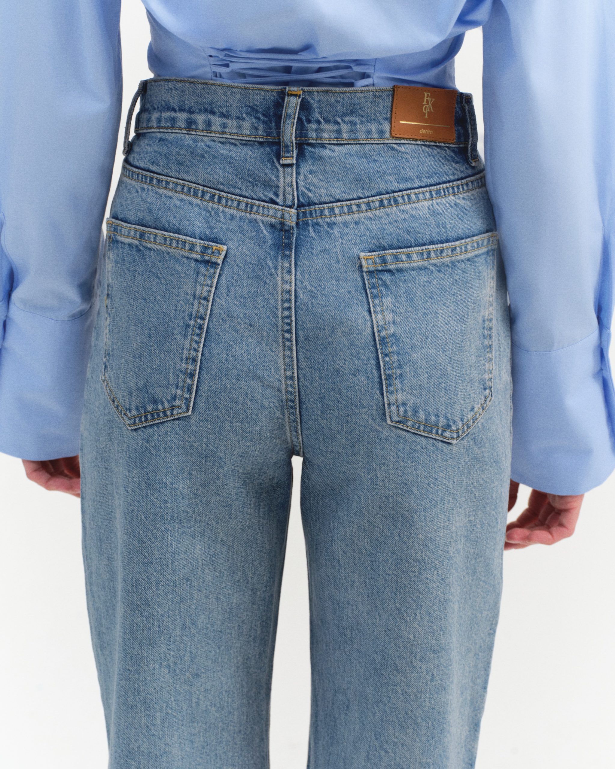 ÜRÜN AÇIKLAMASI: Yüksek belli, beş cepli jean. Beli kemer köprülü. Geniş, uzun paçalı ve yırtmaçlı. Fermuar ve metal düğme ile kapanır.