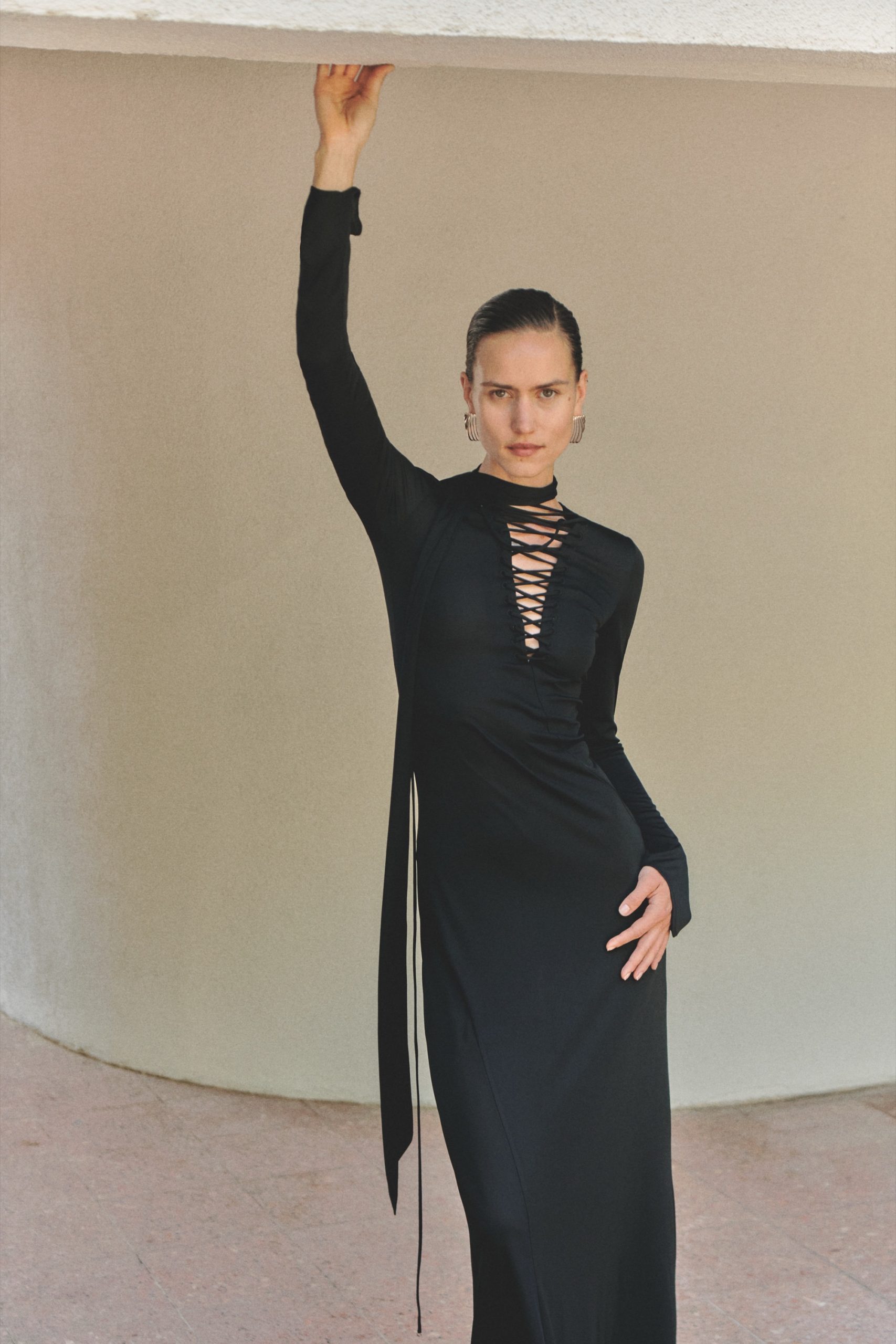 ÜRÜN AÇIKLAMASI: Uzun kollu, bedene oturan, nakış detaylı, derin v yaka üstünden gelen kendinden kumaşından biyeli, kendi kumaşından de-monte fularlı maksi boy elbise.
