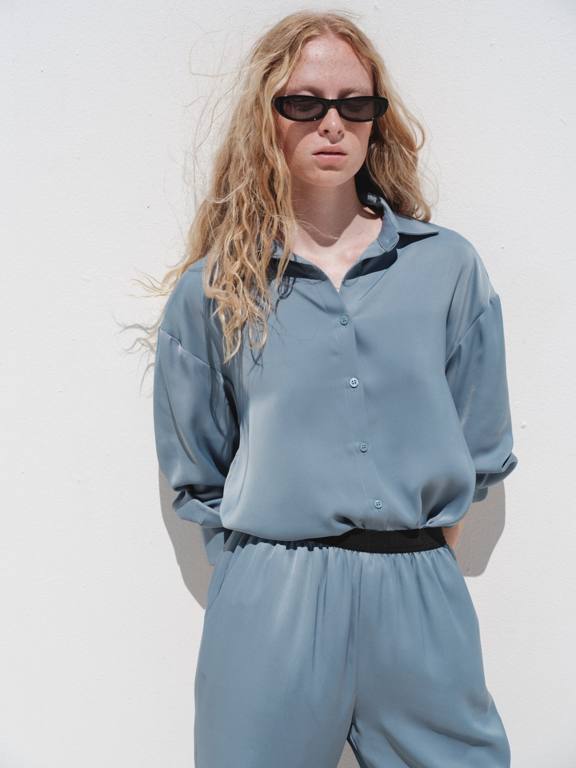 ÜRÜN AÇIKLAMASI: Gömlek yaka, önü düğme iliklemeli, uzun kollu ve manşetli, robalı, oversize kesim saten gömlek. Beli sık lastik detaylı saten pantolon.