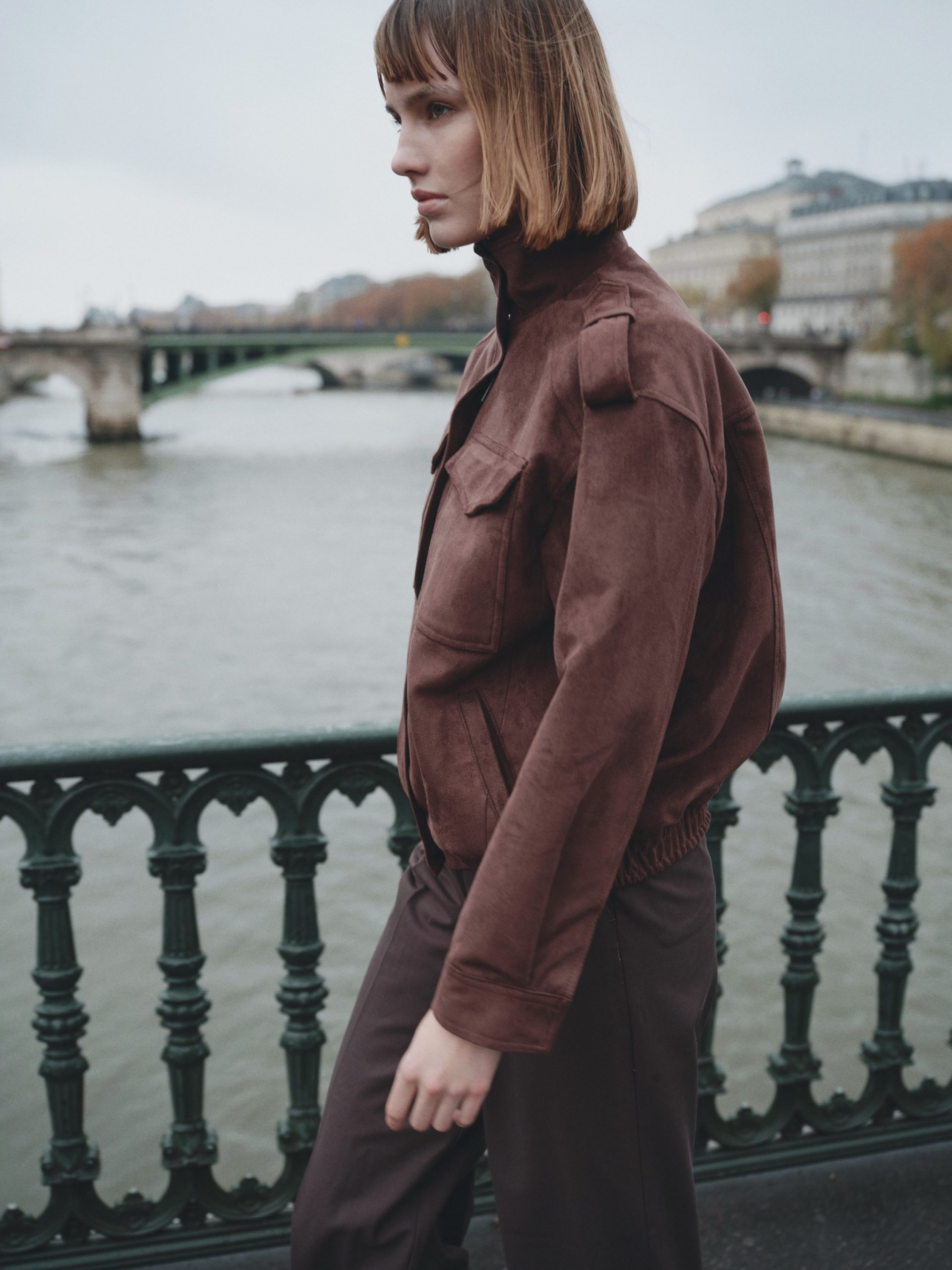 ÜRÜN AÇIKLAMASI: Dik yakalı,önü fermuar kapamalı, apoletli,uzun kollu ve manşetli, yanları cepli, astarlı süet bomber ceket.