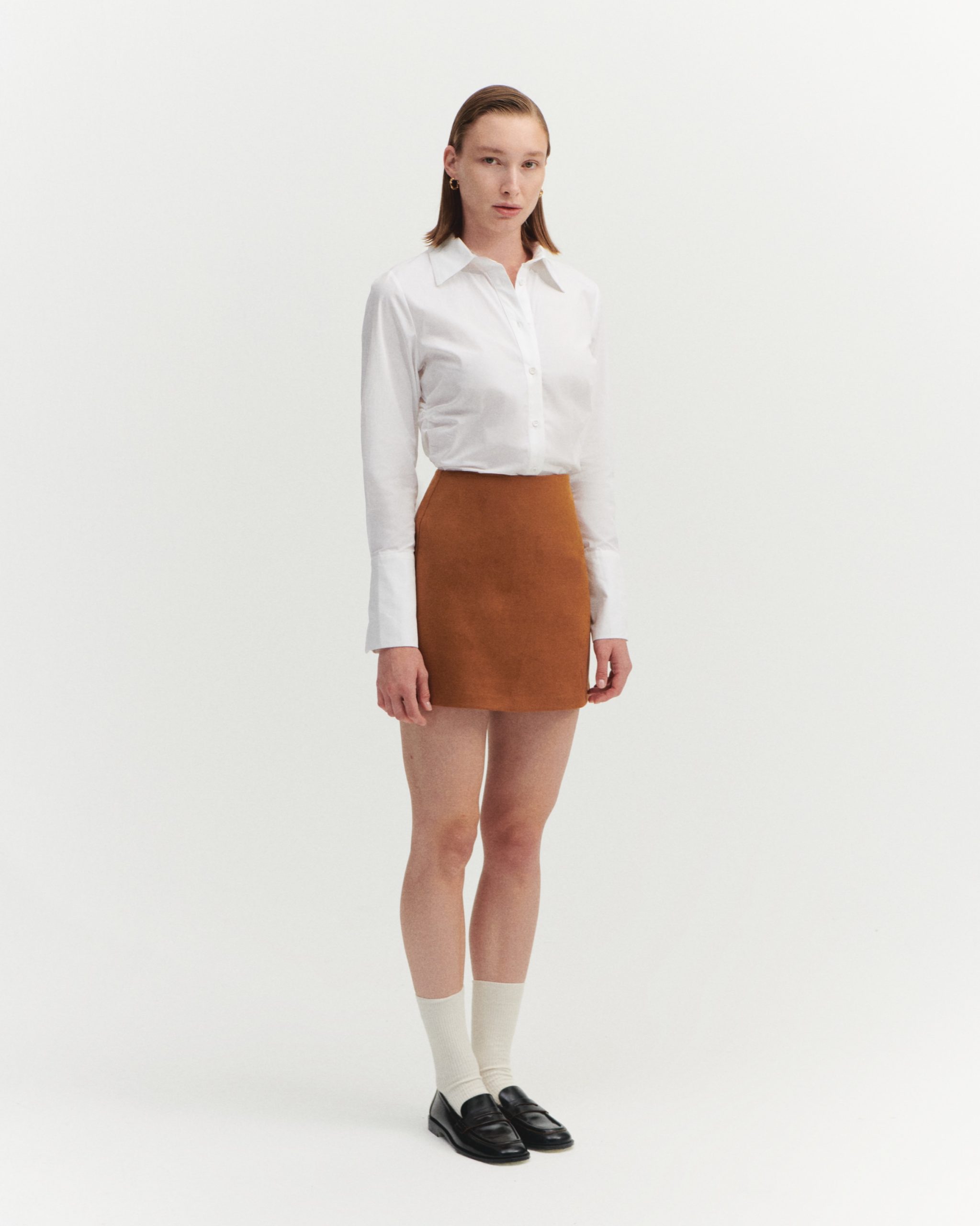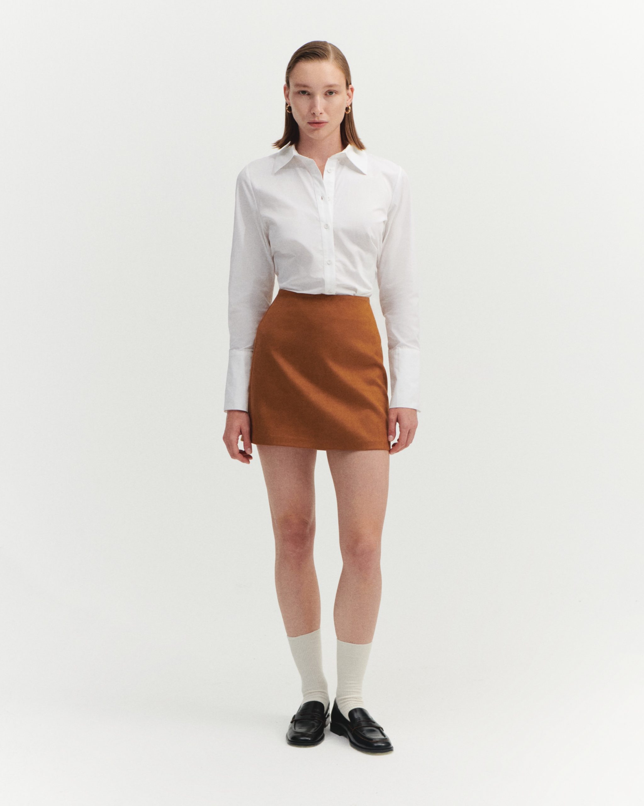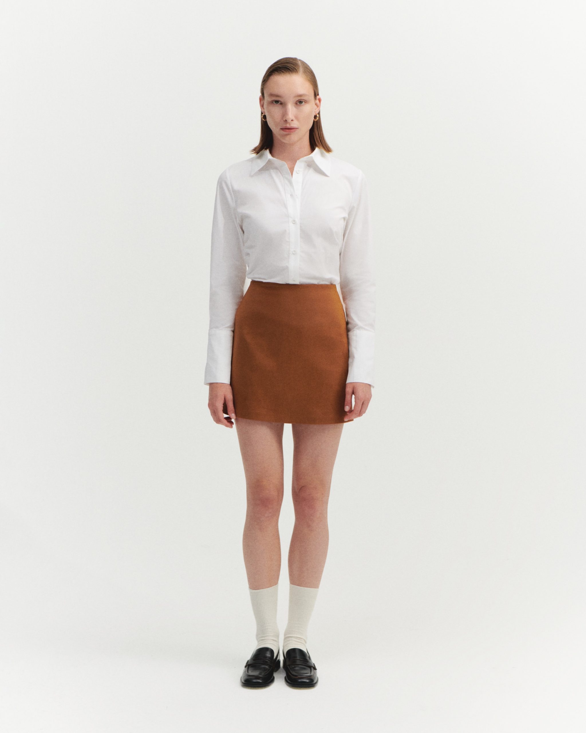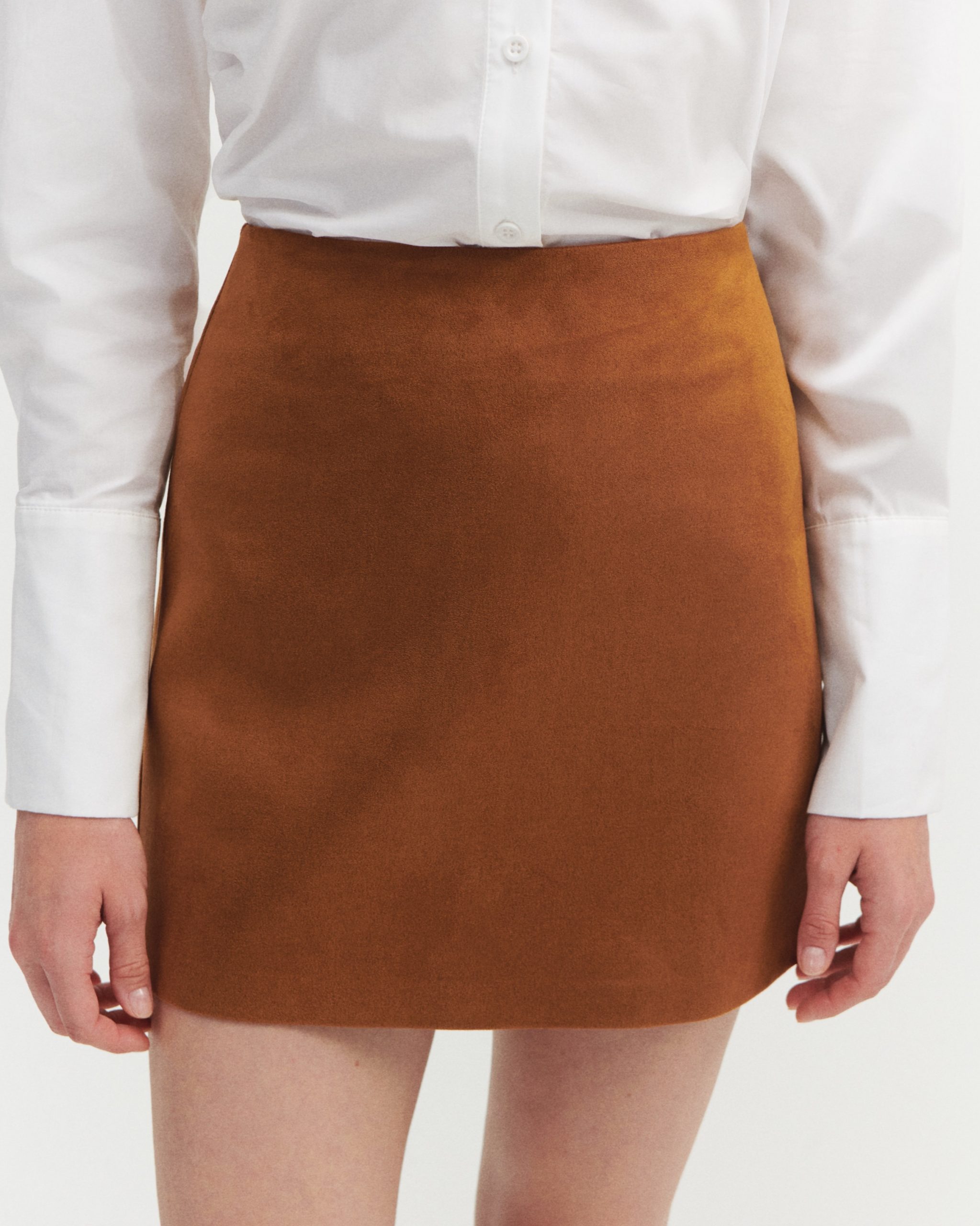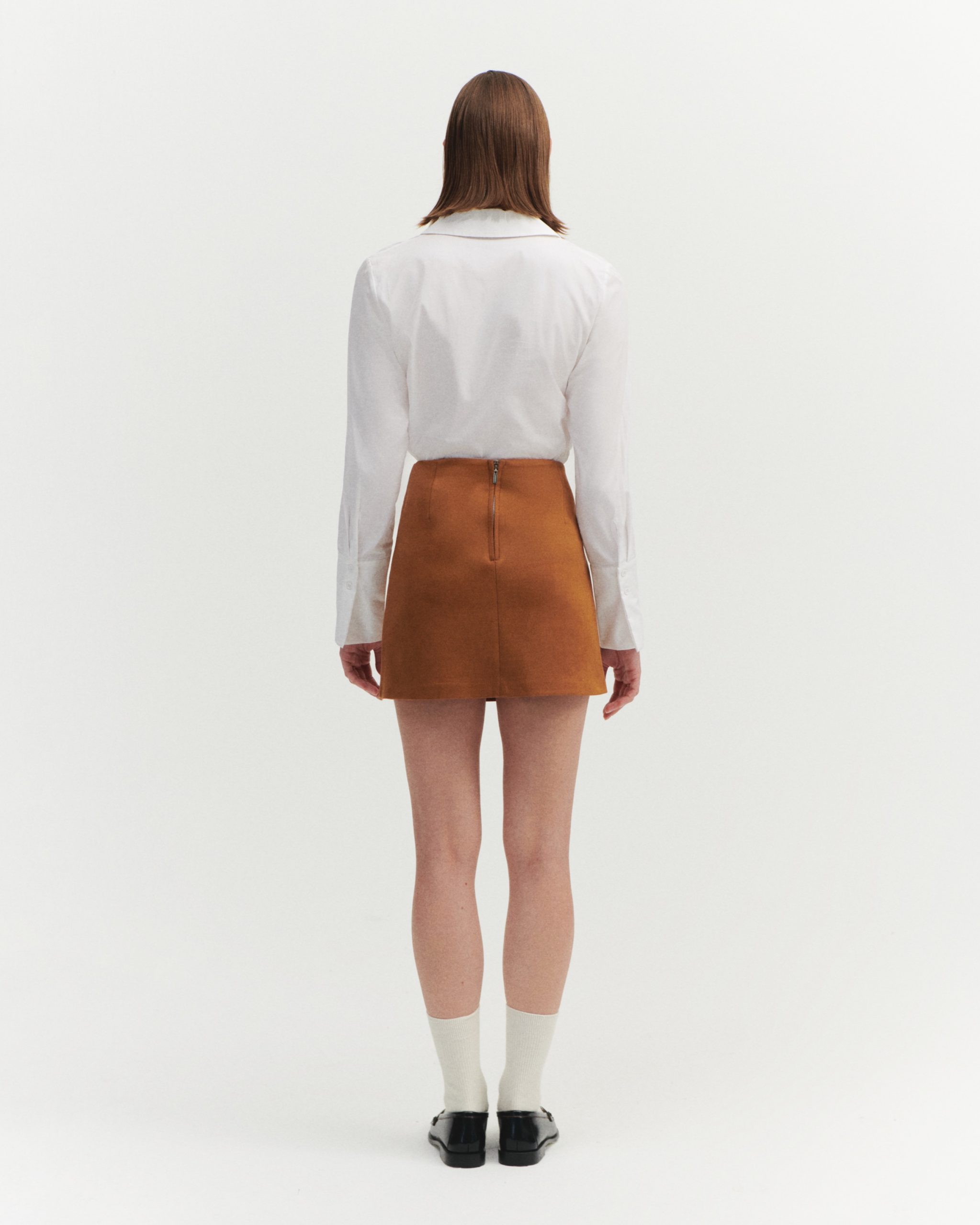 ÜRÜN AÇIKLAMASI: Pervazlı ve pensli, metal fermuar kapamalı mini etek.