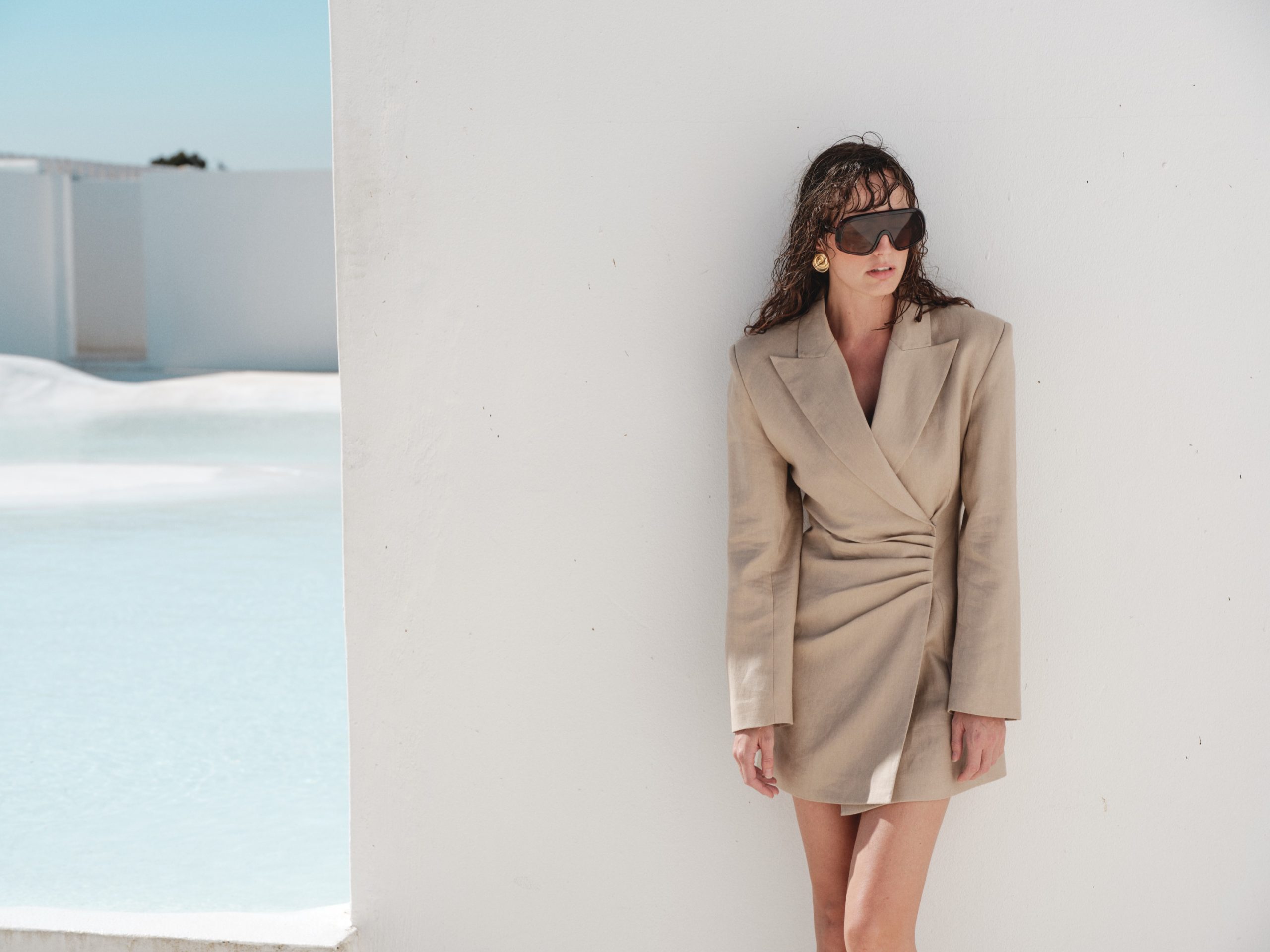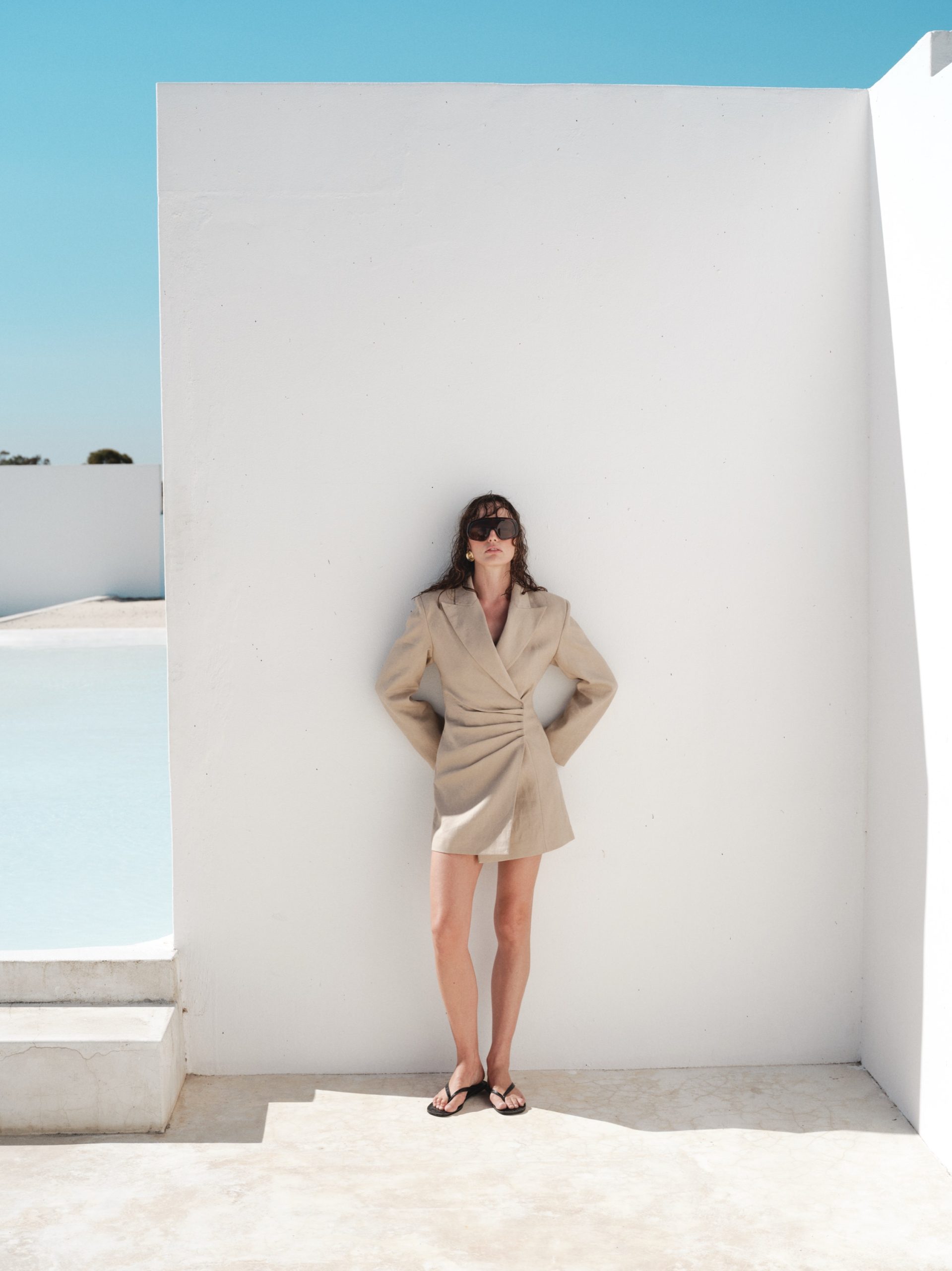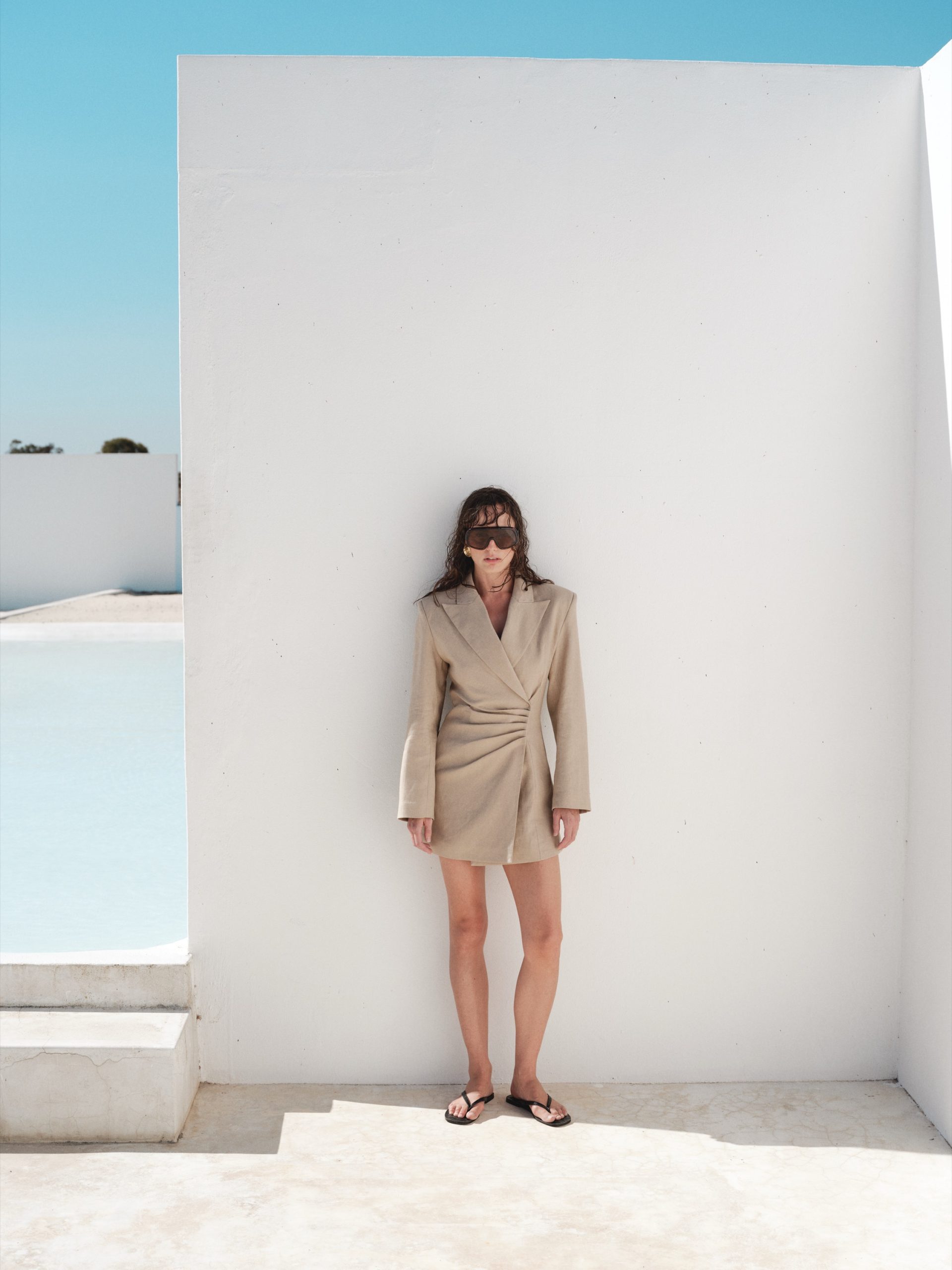 ÜRÜN AÇIKLAMASI: Katlı yaka, vatkalı, uzun kollu, astarlı, kruvaze, metal çıtçıt kapamalı, drapeli keten ceket elbise.