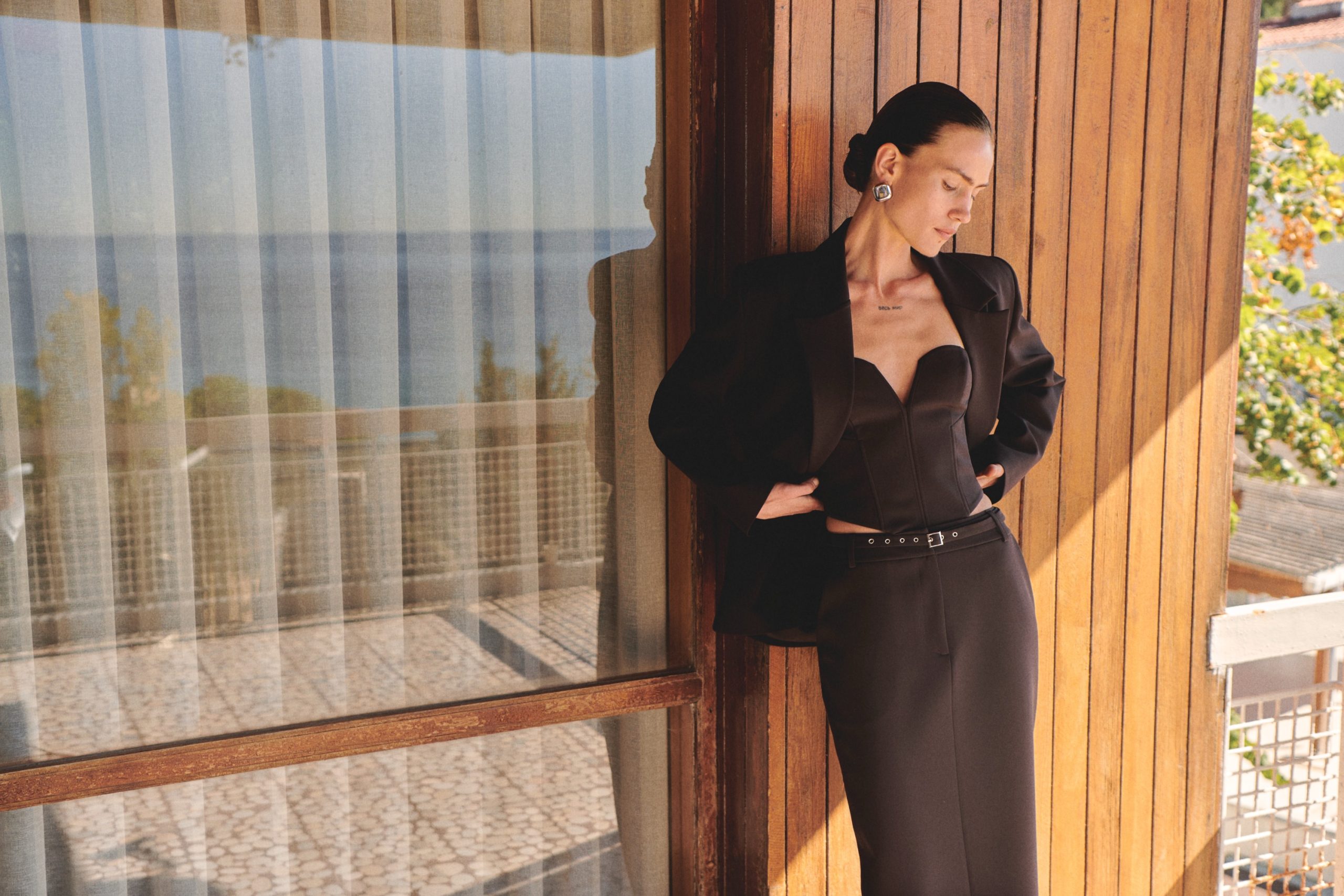TASARIM KUPLU BÜSTİYER-OVERSİZE BLAZER CEKET-TASARIM MİDİ BOY YIRTMAÇLI ETEK