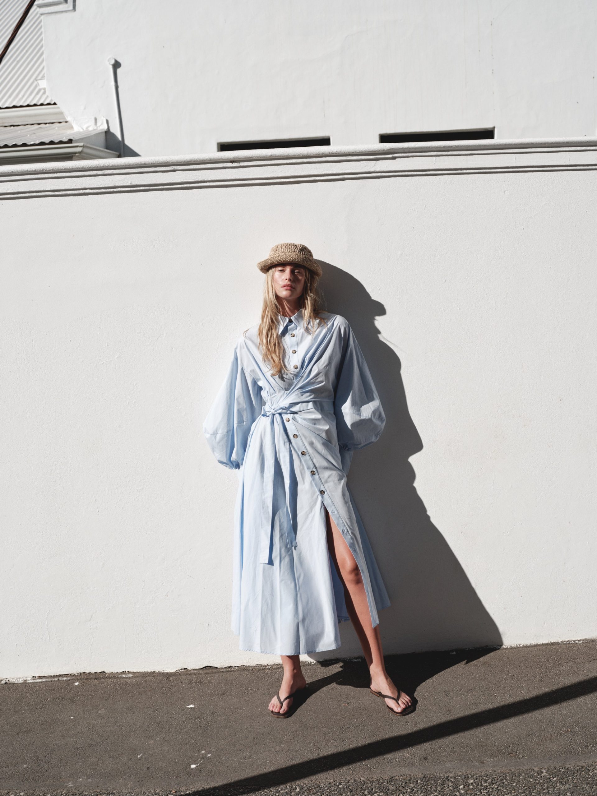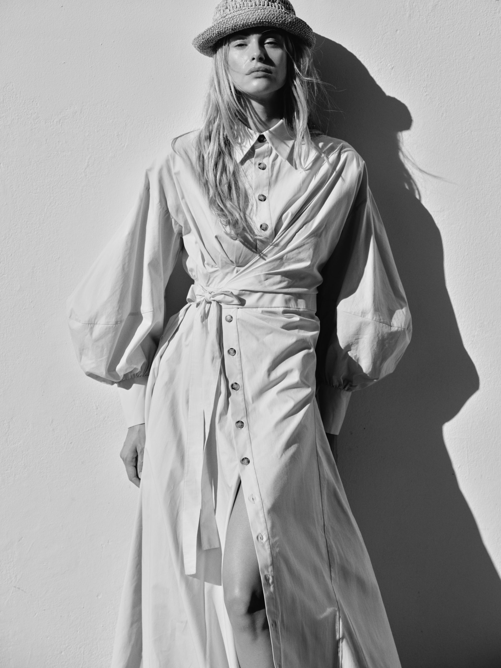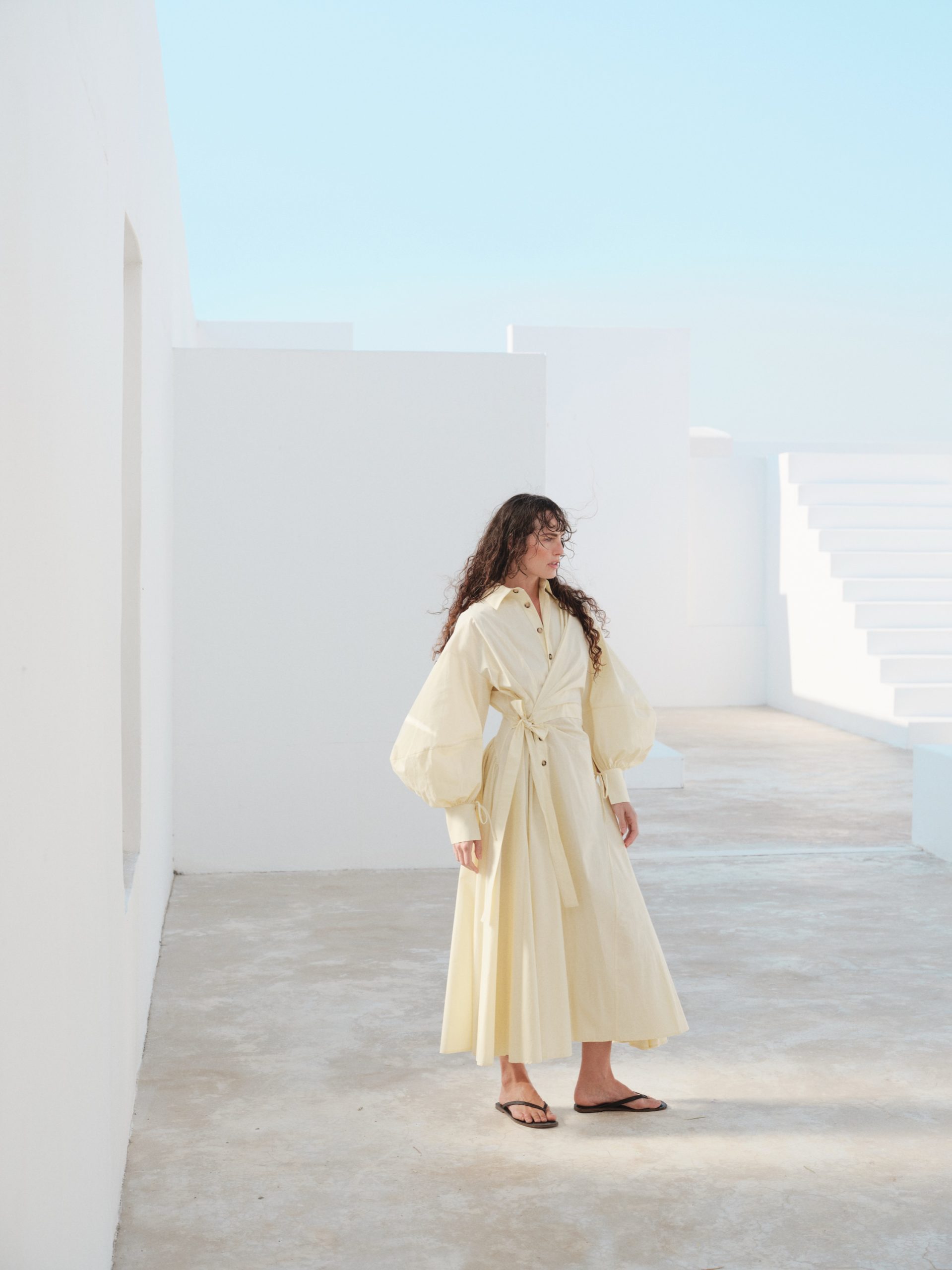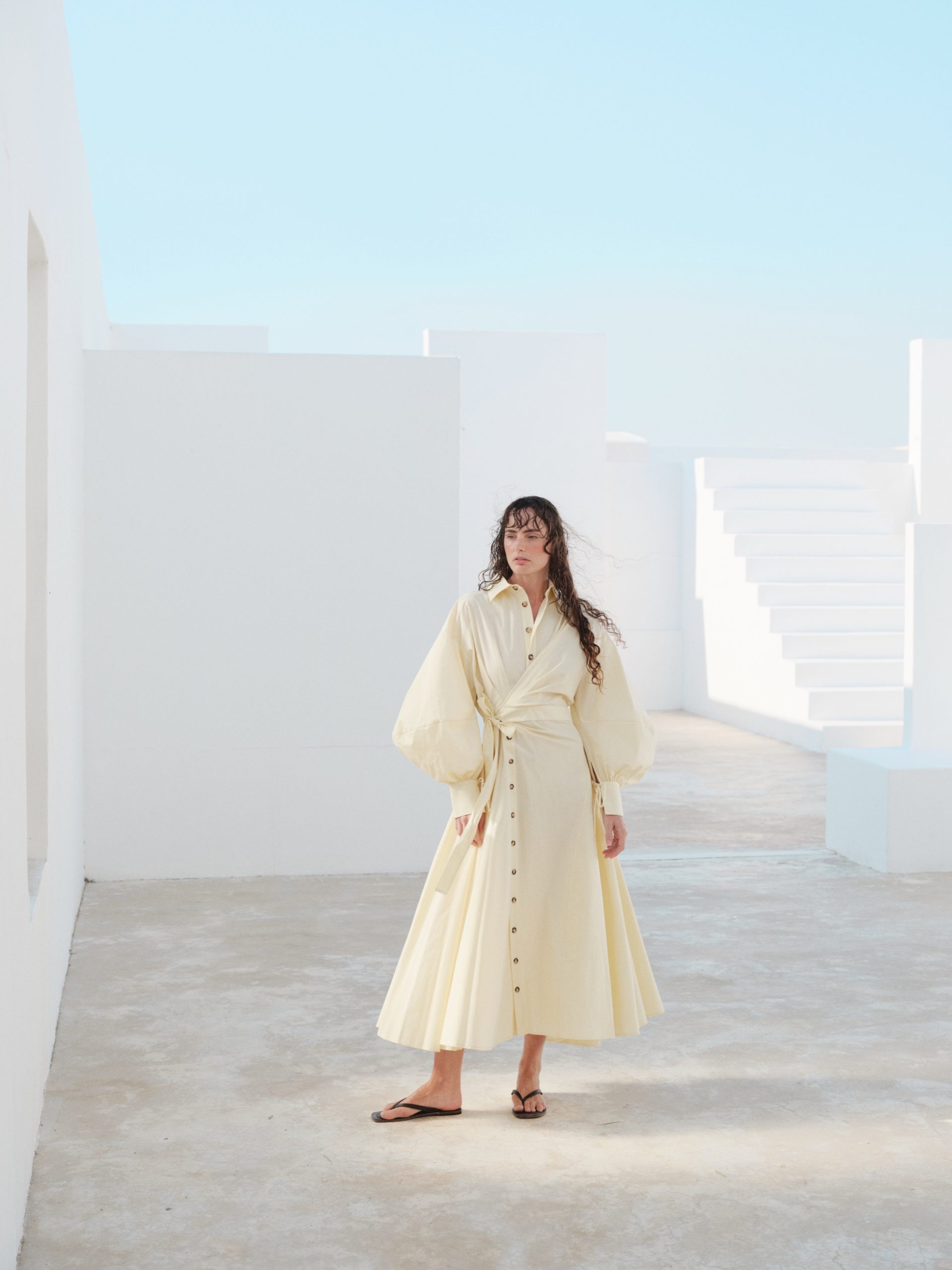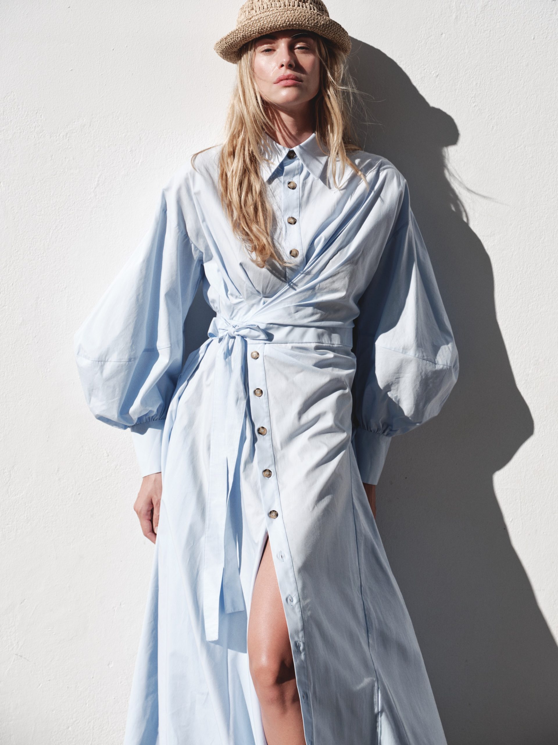 ÜRÜN AÇIKLAMASI: Gömlek yaka, önü düğme iliklemeli, belden bağlamalı, pileli, düşük omuz, uzun ve balon kollu maksi boy elbise.