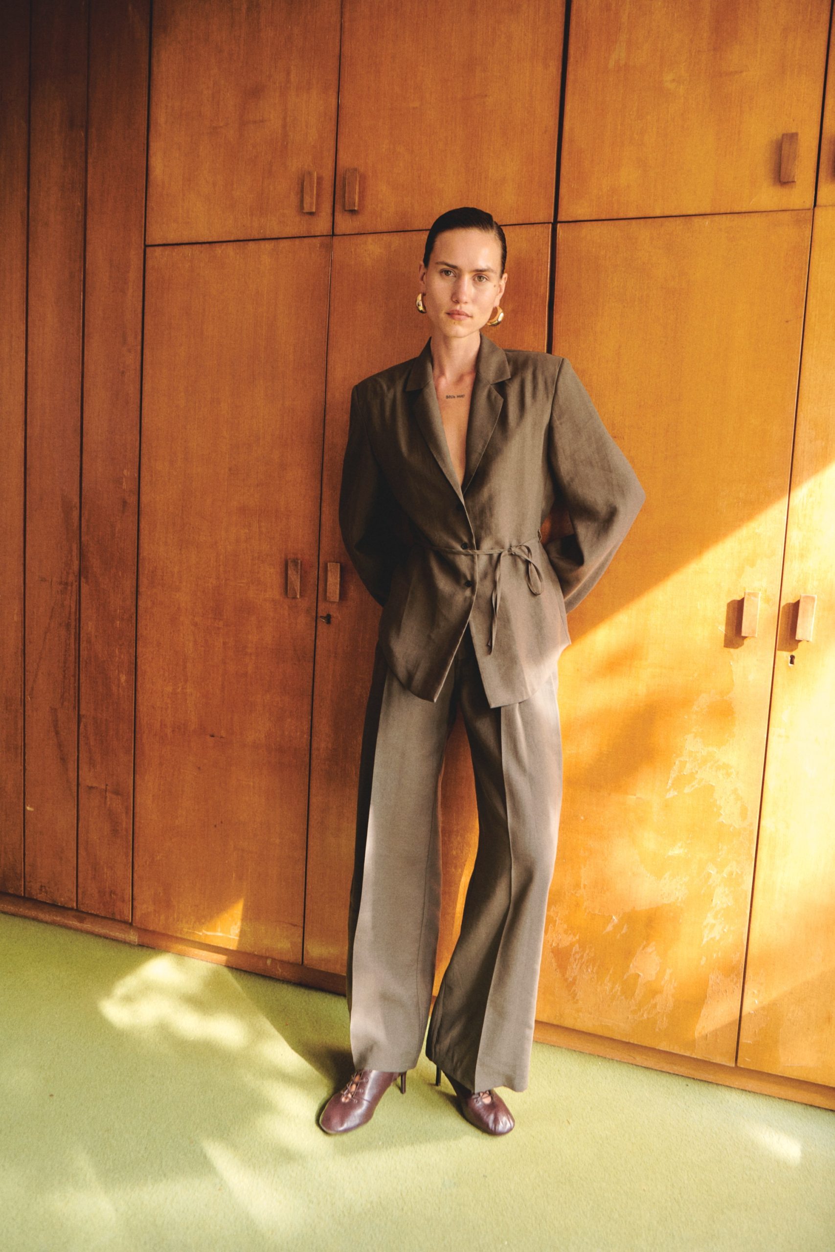 ÜRÜN AÇIKLAMASI: Katlı yakalı, önü düğme iliklemeli, vatkalı, astarsız, kendi kumaşından biyeli ceket. Pileli, yanları cepli, fermuar ve metal kanca kapamalı bol kesim palazzo pantolon.