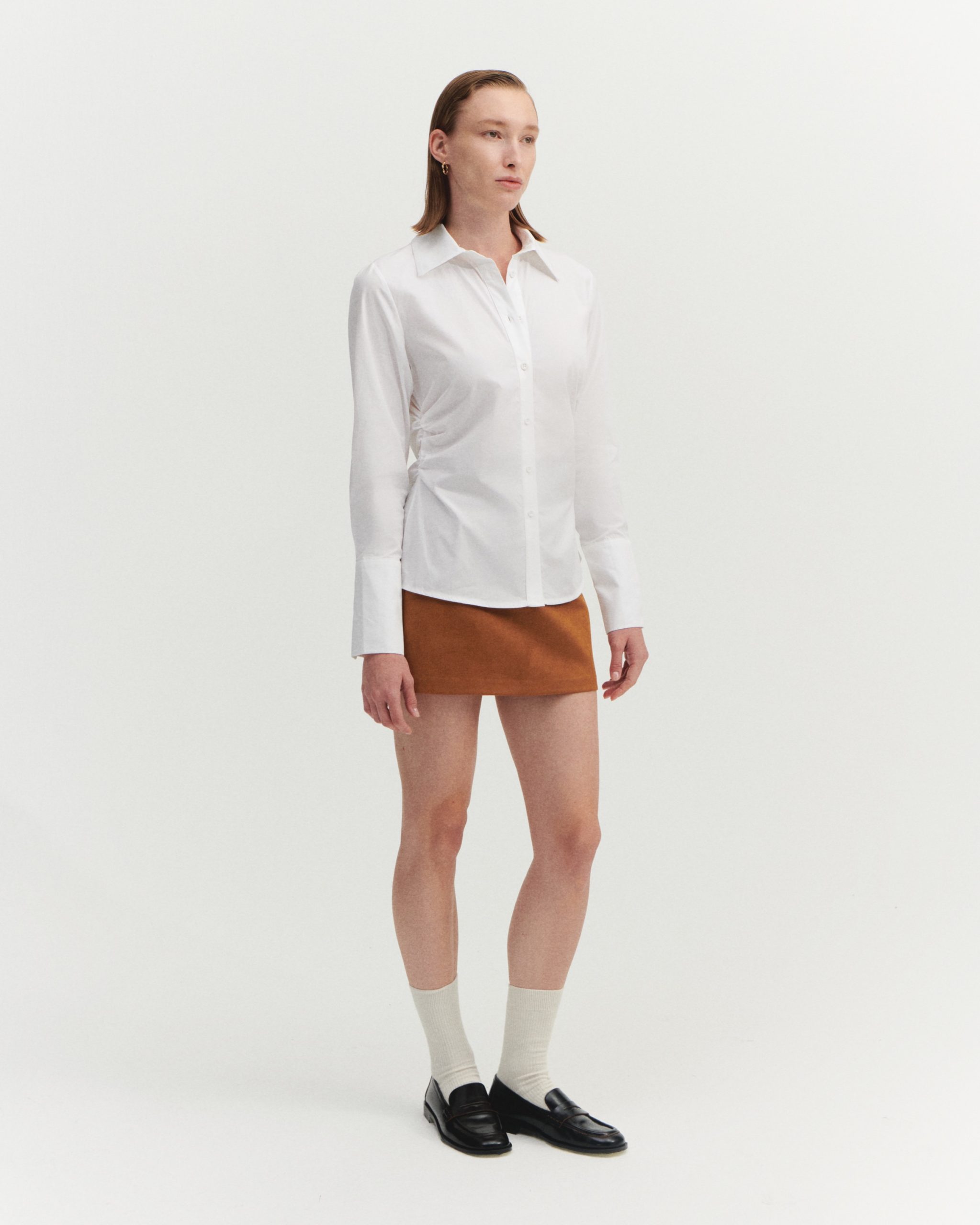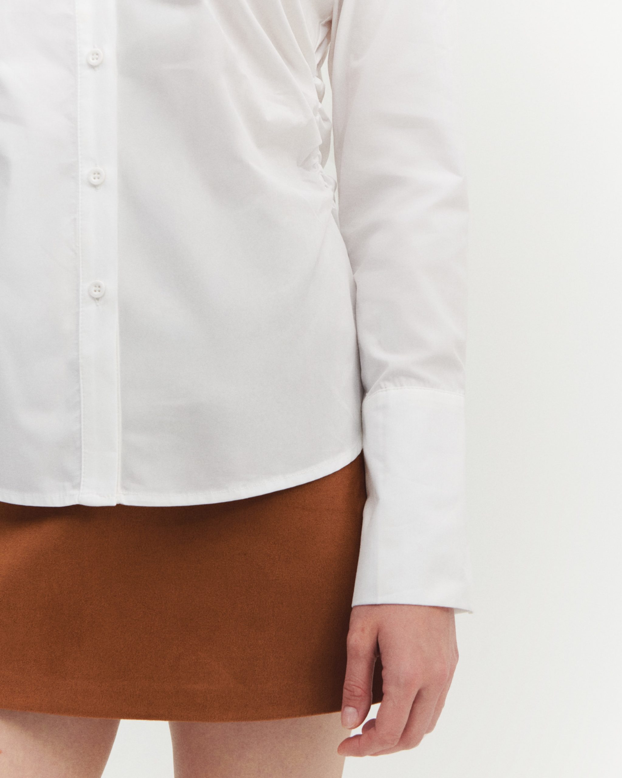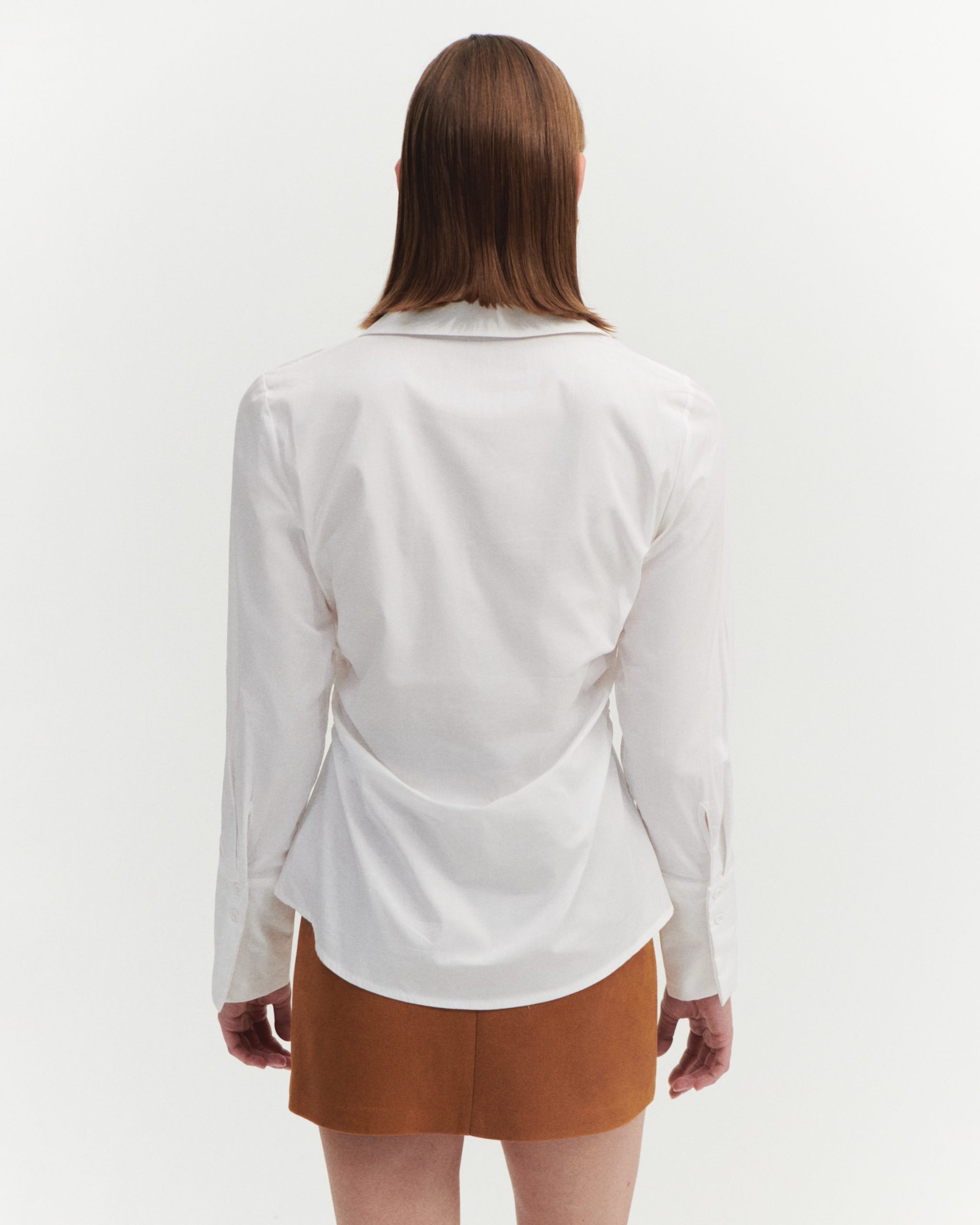 ÜRÜN AÇIKLAMASI: Gömlek yaka, önü düğme iliklemeli, uzun kollu ve manşetli, yanı büzgü detaylı gömlek.