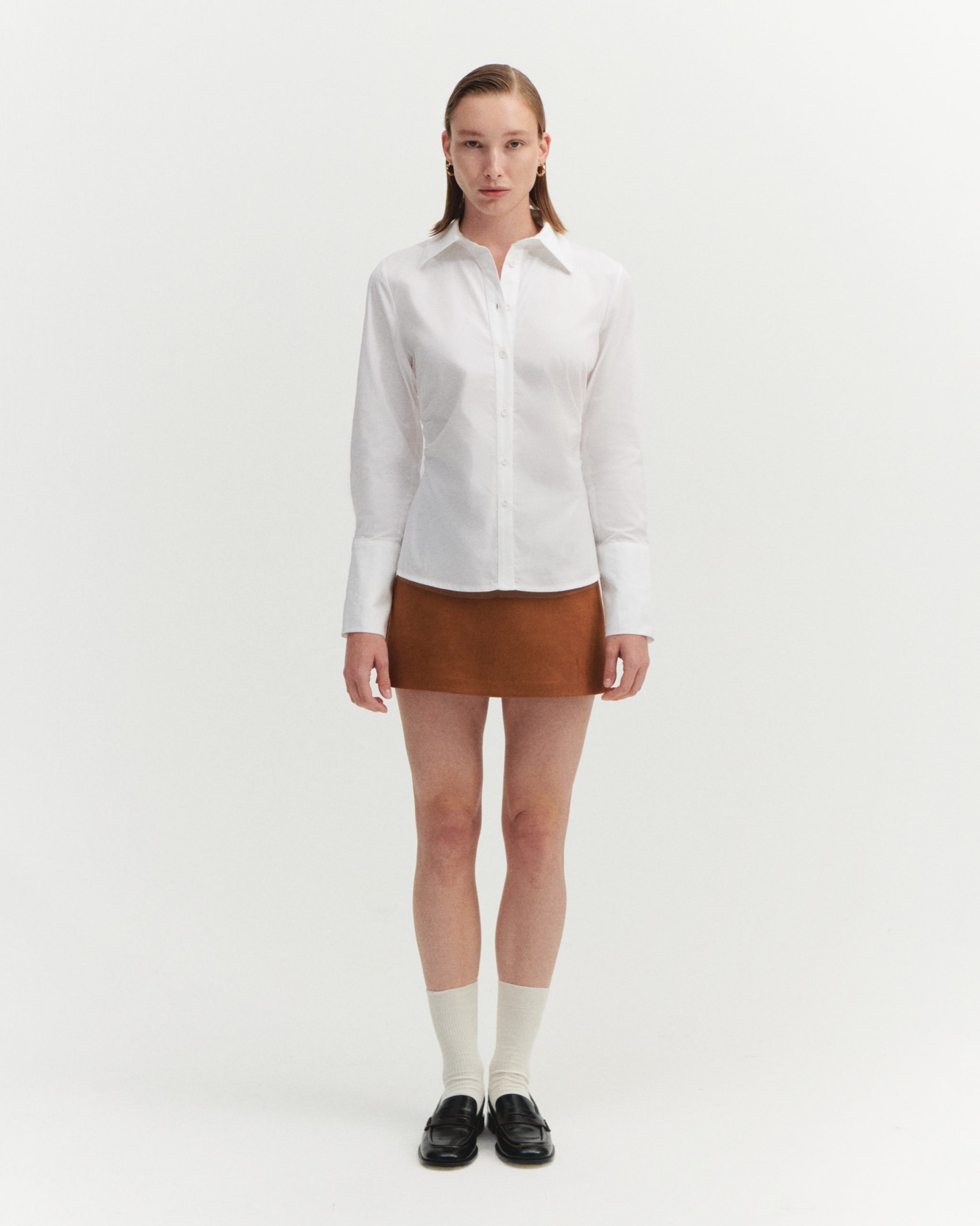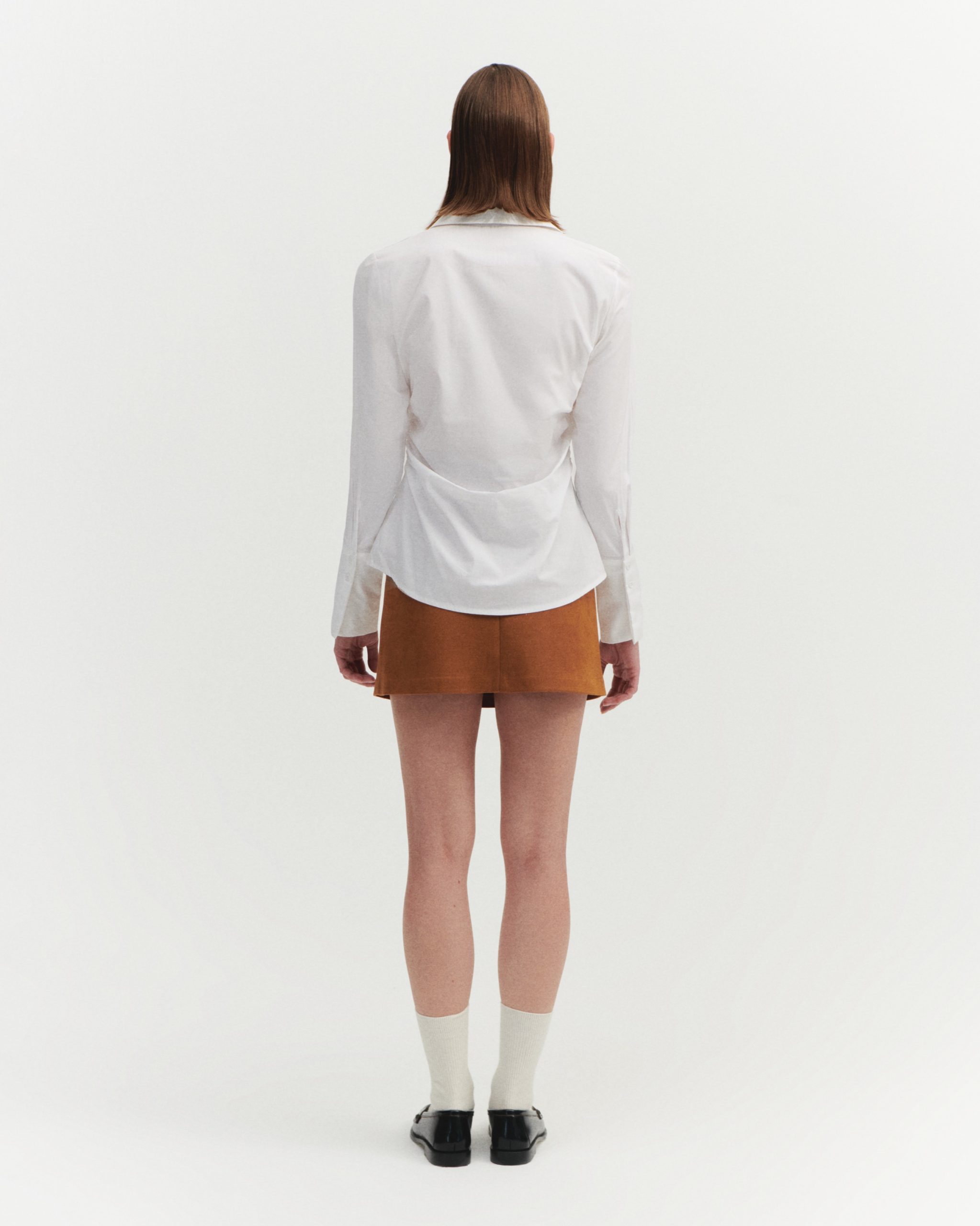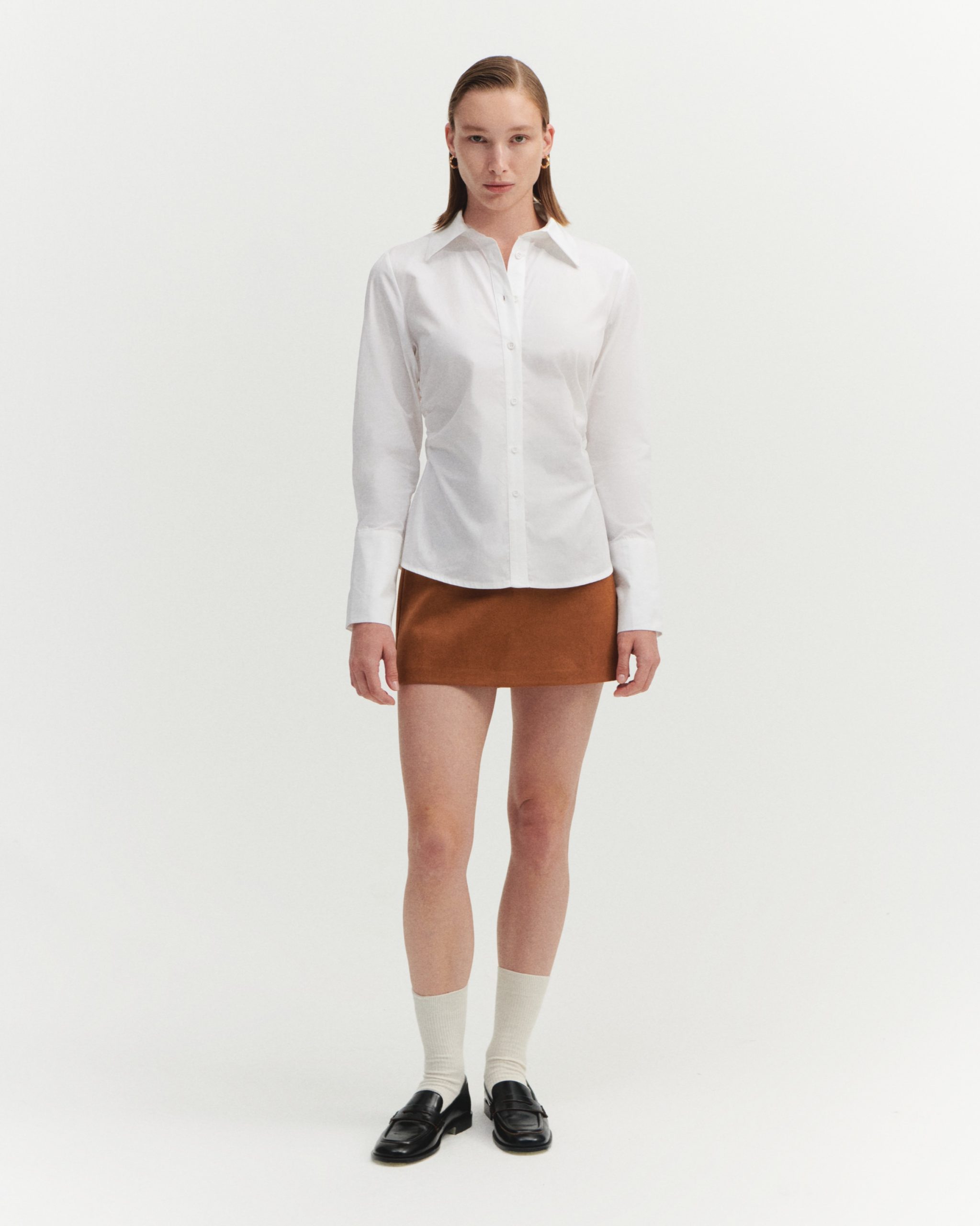 ÜRÜN AÇIKLAMASI: Gömlek yaka, önü düğme iliklemeli, uzun kollu ve manşetli, yanı büzgü detaylı gömlek.